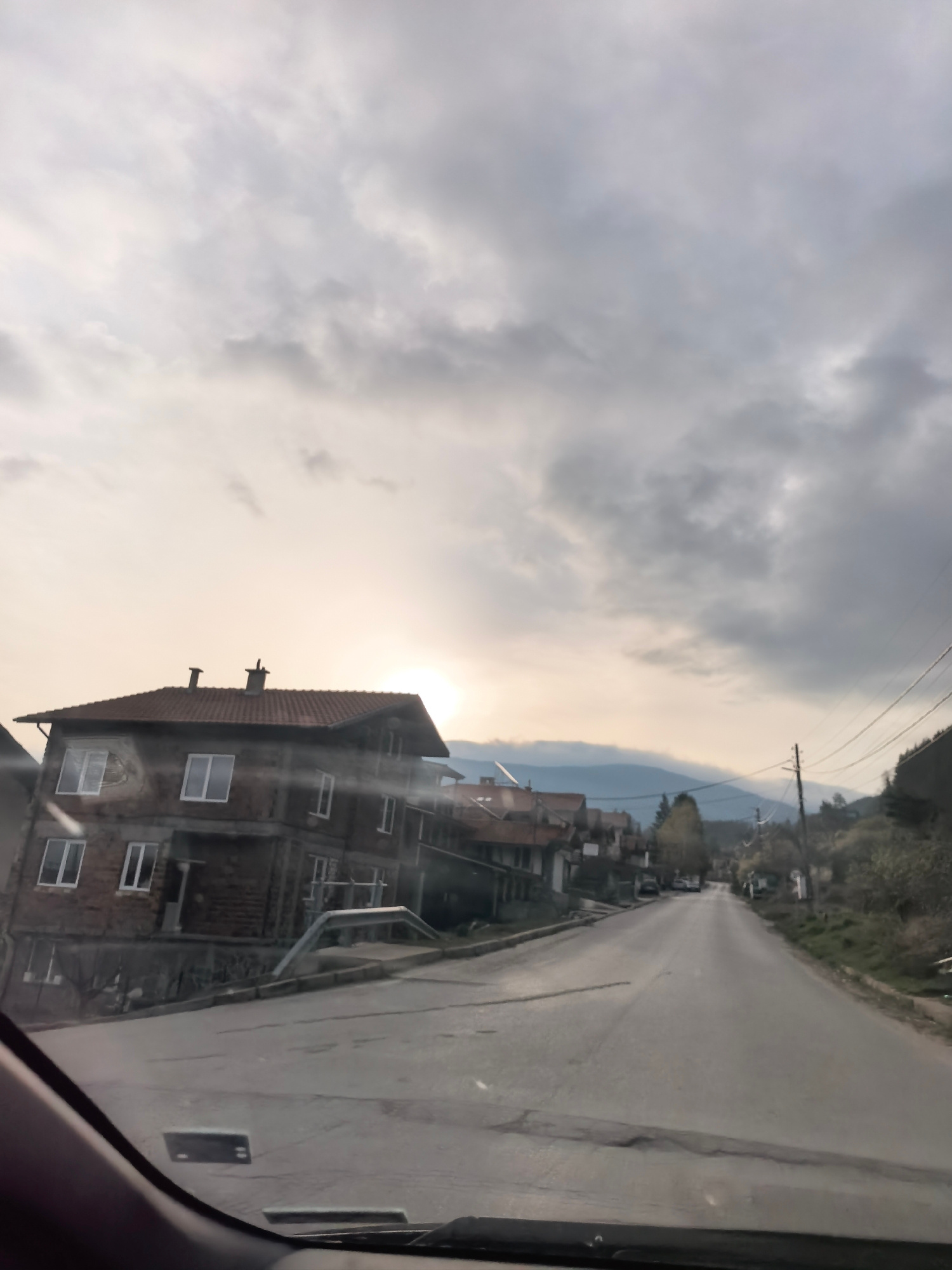 The image shows a street in a town under a cloudy sky. The sun is partially obscured by clouds, creating a diffused light. On the left side of the road, there is a two-story building with a red tile r…read more