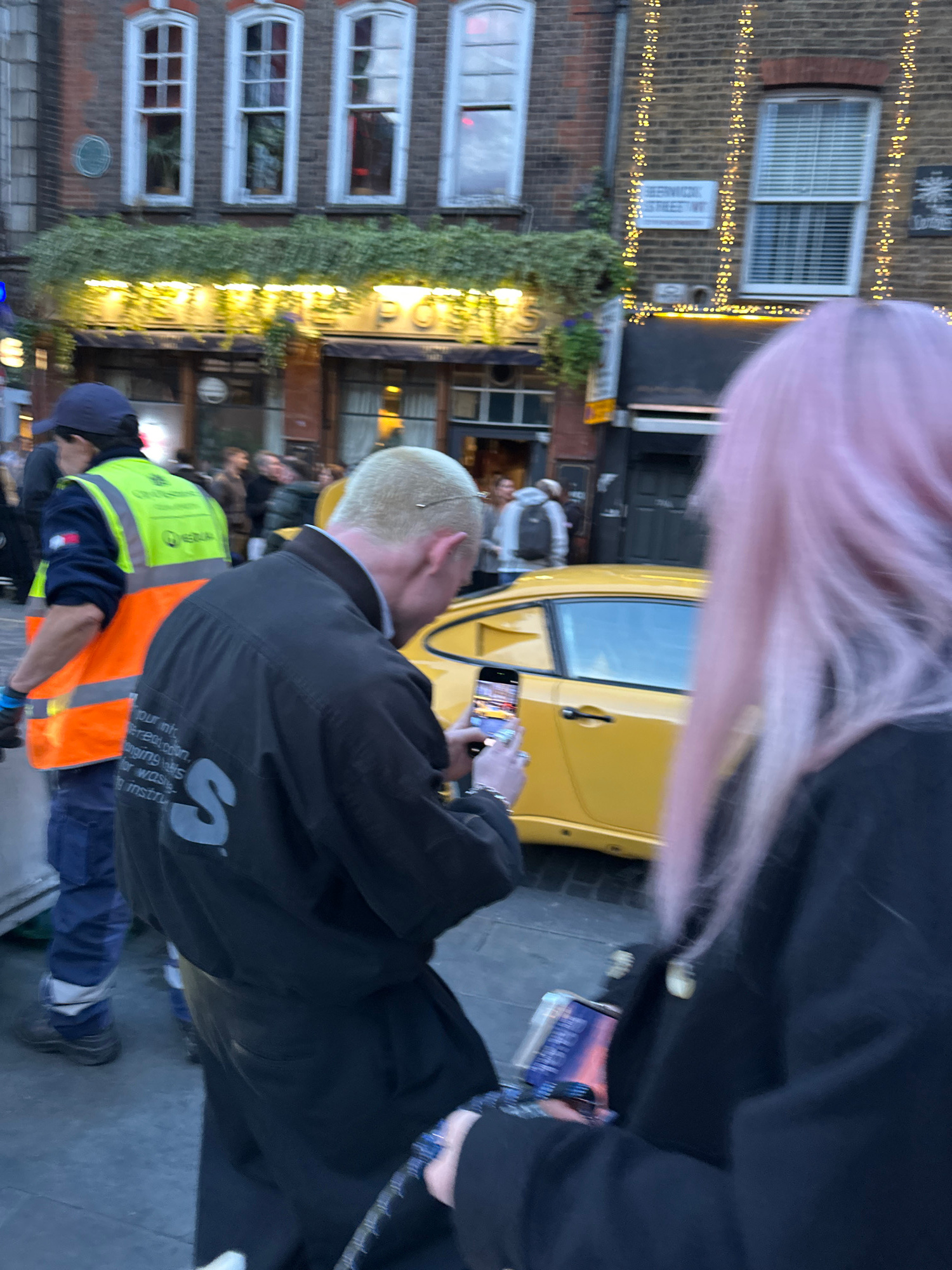 The image depicts a vibrant street scene in London during dusk or early evening, characterized by artificial lighting. The perspective is slightly tilted, capturing individuals and buildings along a b…read more