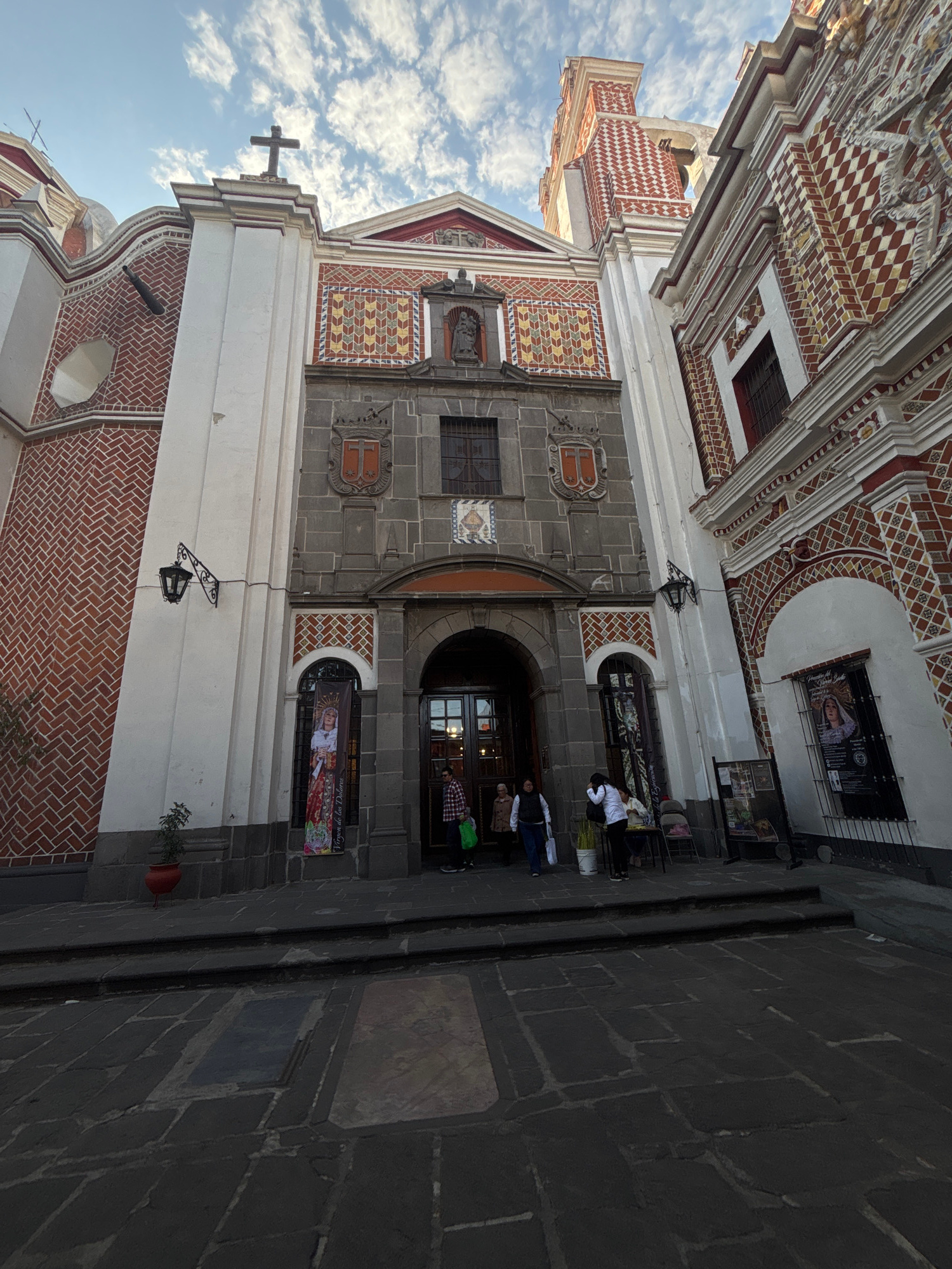 The image shows a view of the richly decorated facade of the Templo de San Francisco Acatepec church in San Andrés Cholula, near Puebla, Mexico. The facade features a combination of grey stone, white…read more