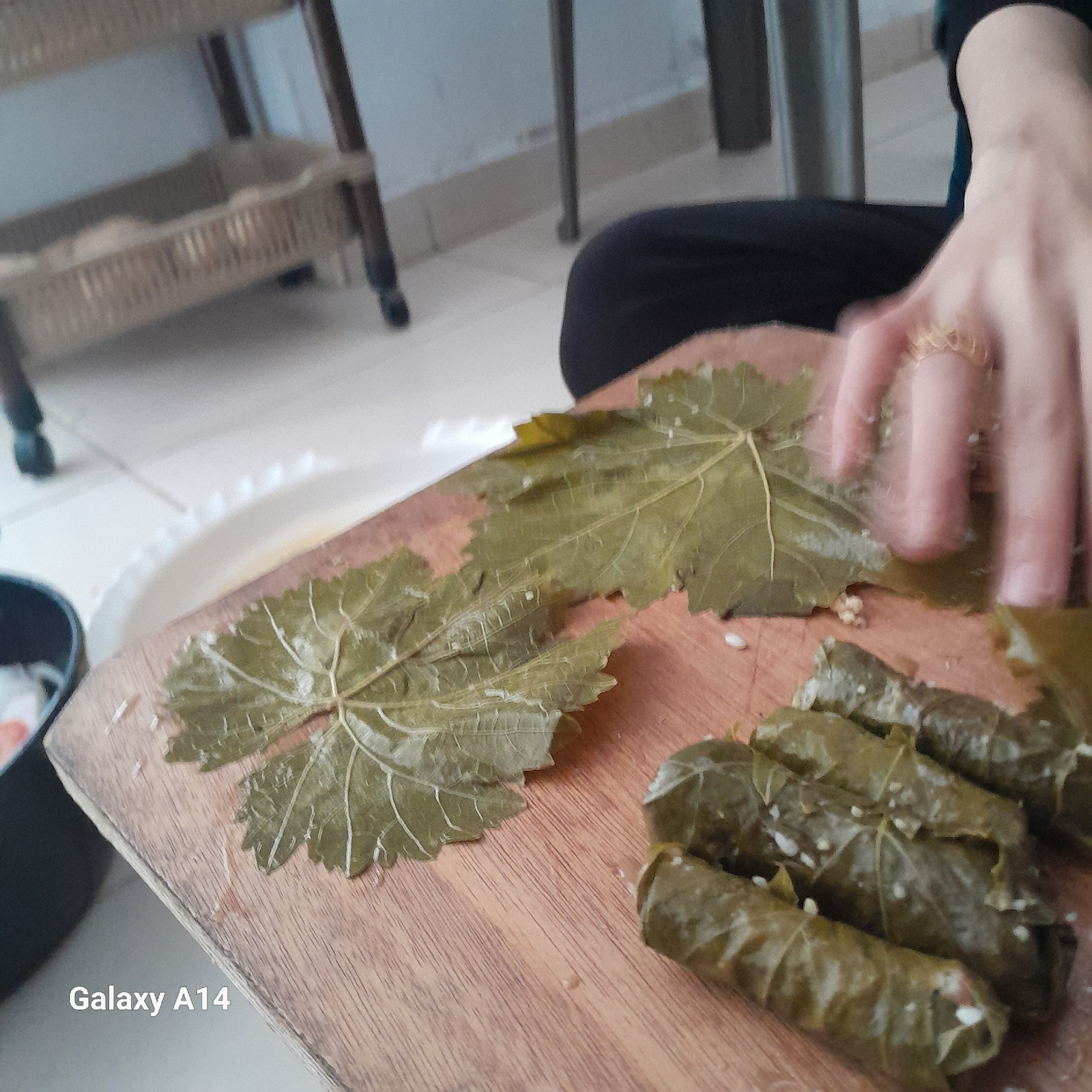 The image shows a person preparing stuffed grape leaves on a wooden cutting board. Several rolls of stuffed grape leaves are already completed, while some raw leaves are laid out for preparation. A hu…read more