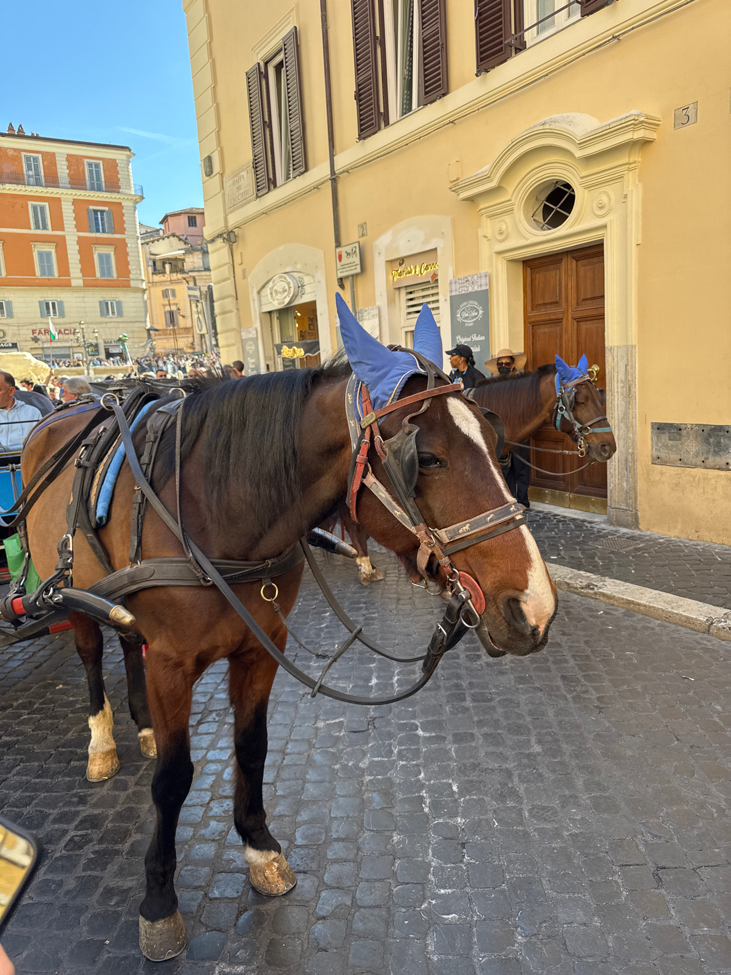 The image depicts a close-up view of two horses harnessed for carriage rides on a cobblestone street in Rome, Italy. The primary horse, a chestnut brown color with a white blaze on its forehead, is eq…read more