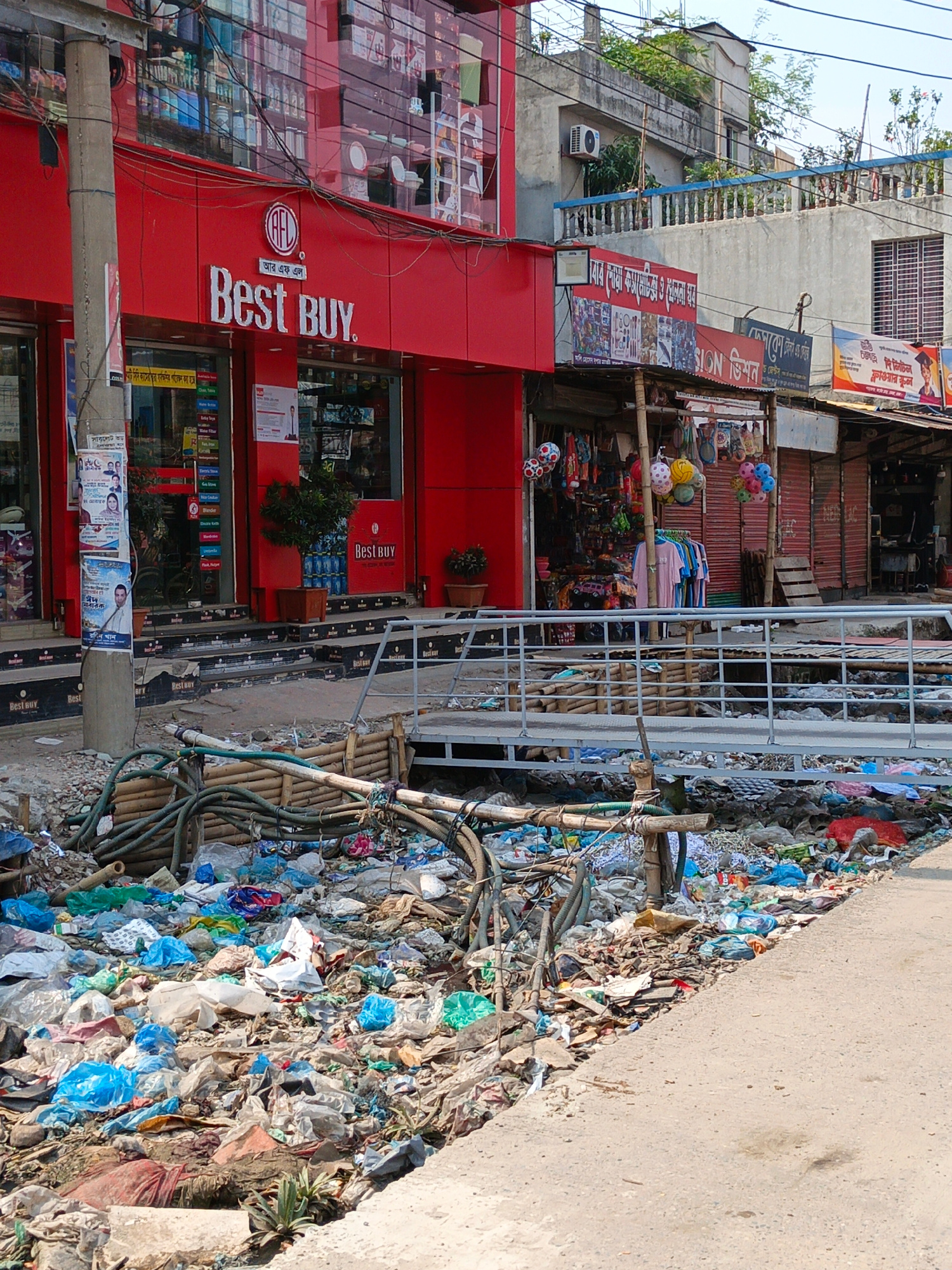 The image depicts a street scene in Dhaka, Bangladesh. A large amount of garbage fills a drainage ditch running alongside the road. The garbage includes plastic bags, discarded objects, and other debr…read more