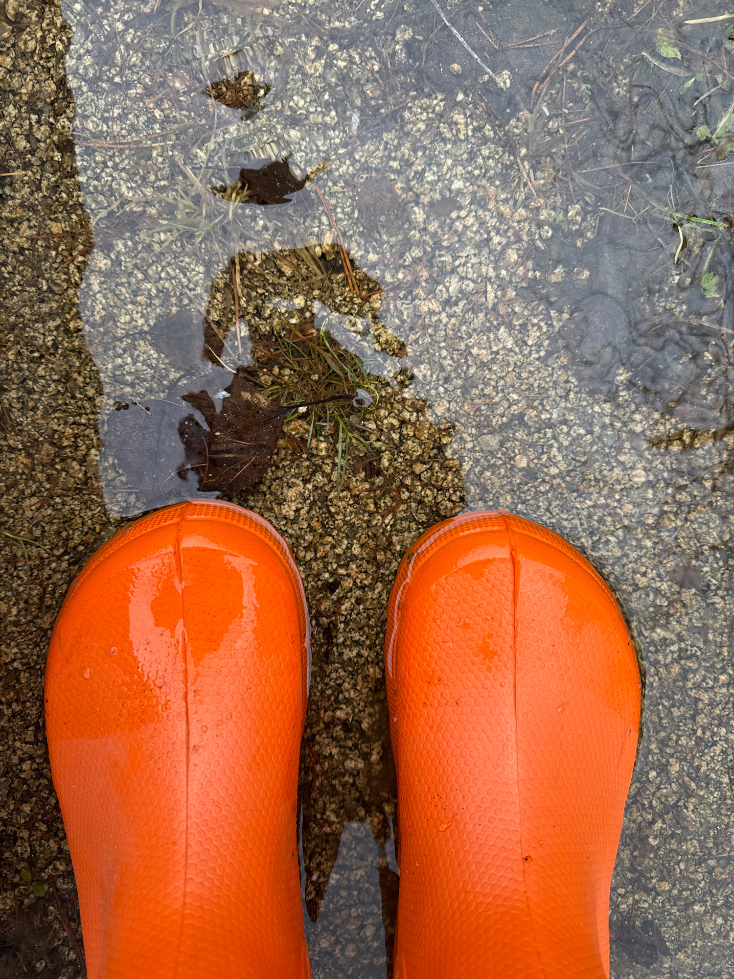 The image shows two orange rain boots standing in a puddle. The puddle sits on a concrete or stone surface mixed with gravel and debris such as twigs and leaves. The water is slightly murky, with clea…read more