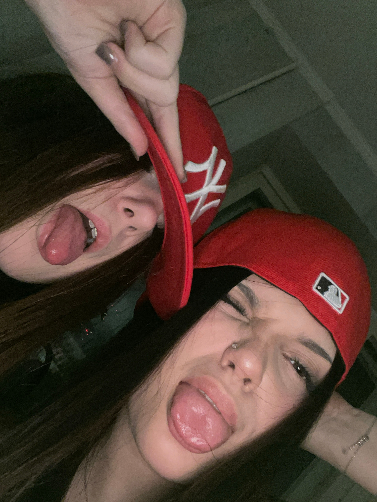 Two young women are posing close to each other, sticking their tongues out for the camera. Both are wearing red baseball caps. The woman closer to the camera has a New York Yankees cap, with the logo…read more