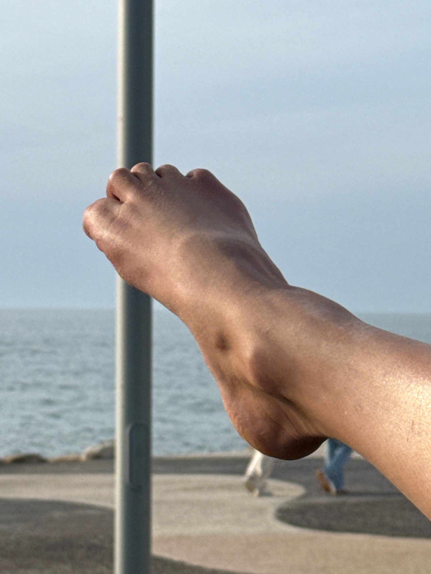 A close-up, angled photograph captures the left bare foot and a portion of the lower leg of an individual, positioned in the foreground and extending from the lower right towards the upper left. The f…read more