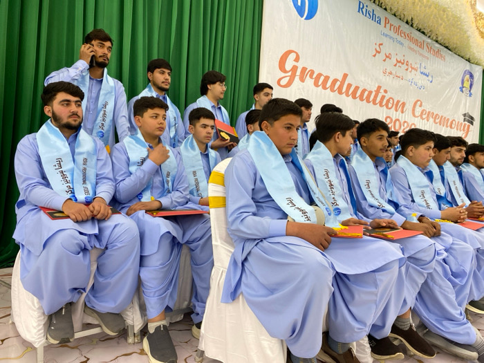 A group of young men are seated in rows at a graduation ceremony. They are all dressed in matching light blue outfits and wearing light blue sashes with writing in another language. Each person is hol…read more