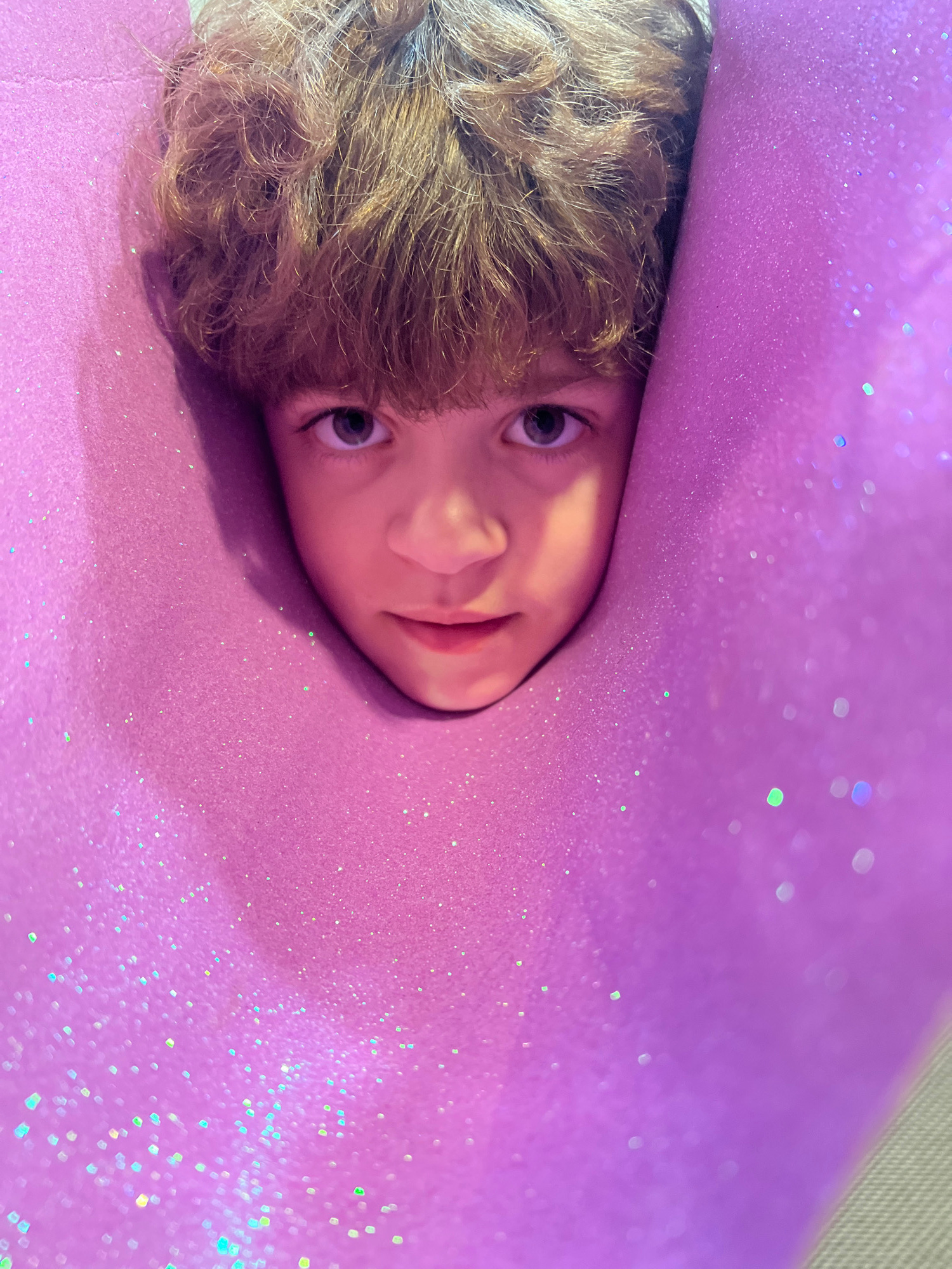 A child's face peers out from a hole in a sheet of sparkly, pink material. The child has light brown hair and gray eyes, and is looking directly at the camera. The material appears to be draped around…read more