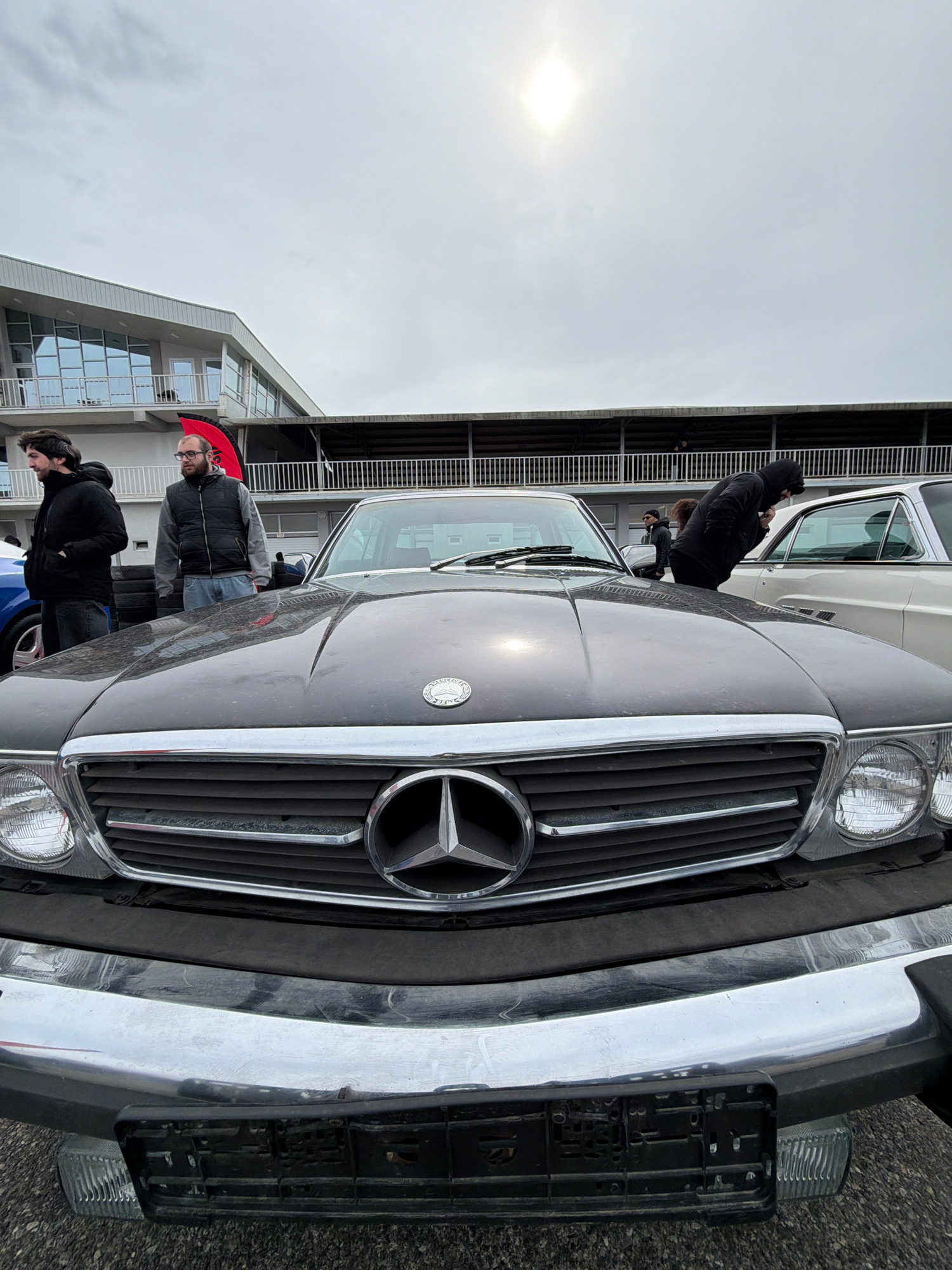 A low-angle, full-color shot features the front end of a dark-colored Mercedes-Benz, likely a vintage model, with its distinctive chrome grill and star emblem prominently displayed. To the right of thβ¦read more