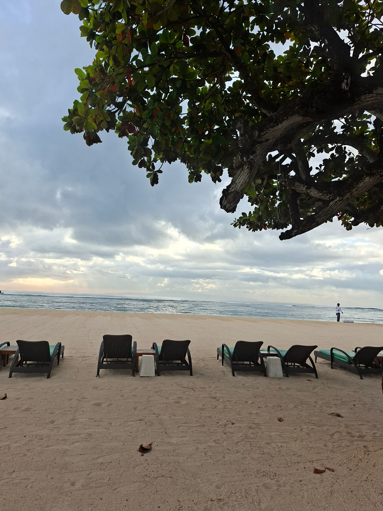 The image shows a beach scene in Denpasar, Indonesia. The view is vertical. A large tree with green and orange leaves is on the left side of the frame. To the right of the tree, there is an ocean with…read more