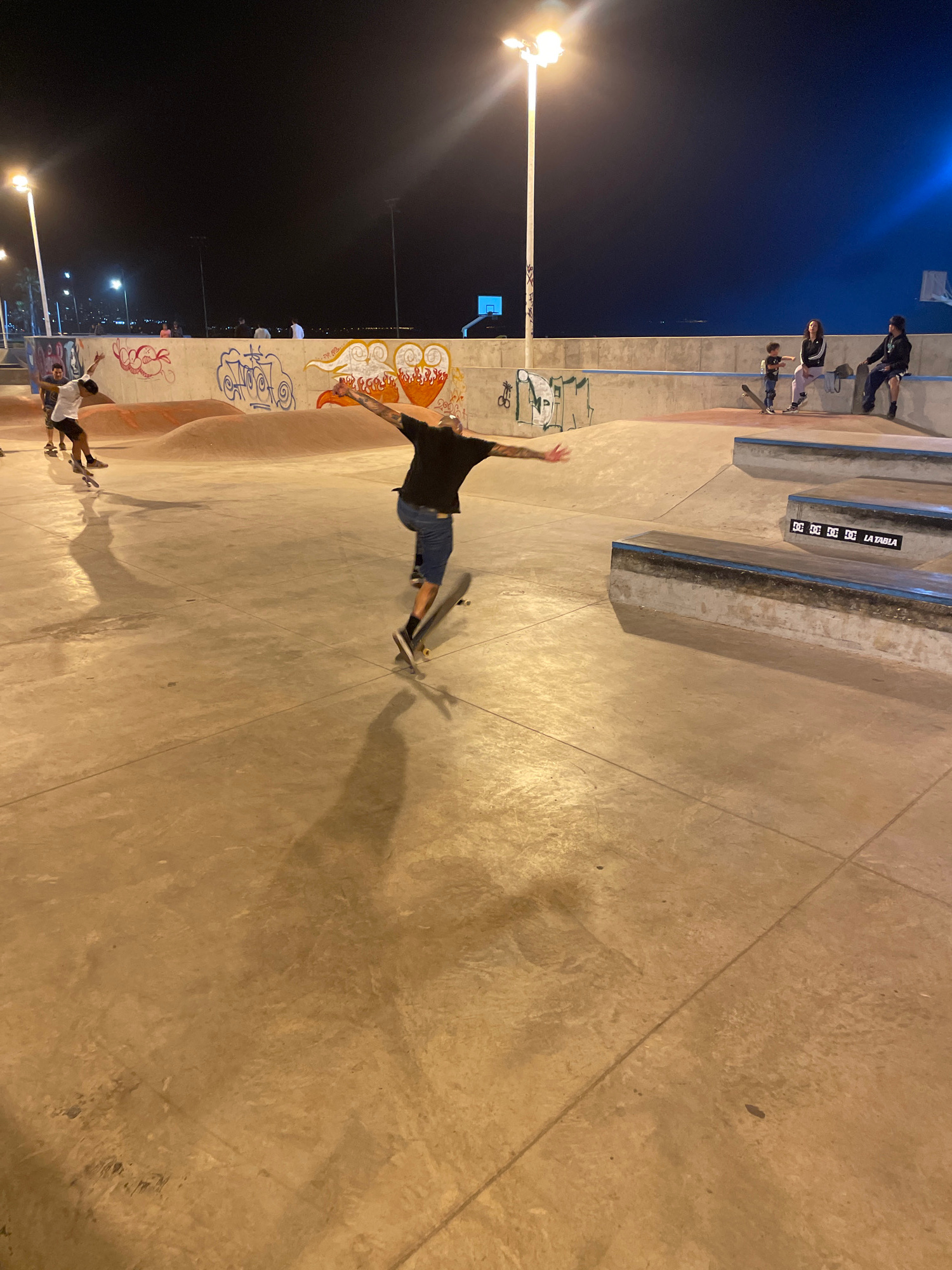 The image shows a concrete skatepark at night with overhead lighting. In the foreground, a skateboarder is mid-trick, their arms outstretched. The skateboard is slightly elevated off the ground. Other…read more