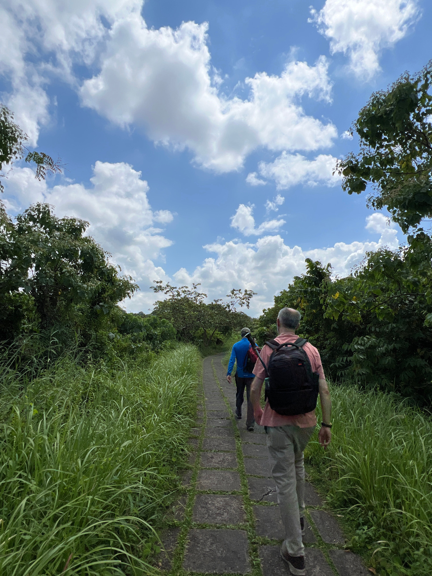 Two people are walking on a stone path in a grassy area under a partly cloudy sky. The location is Ubud, Indonesia. The first person is wearing a pink shirt, gray pants, and a black backpack. The seco…read more