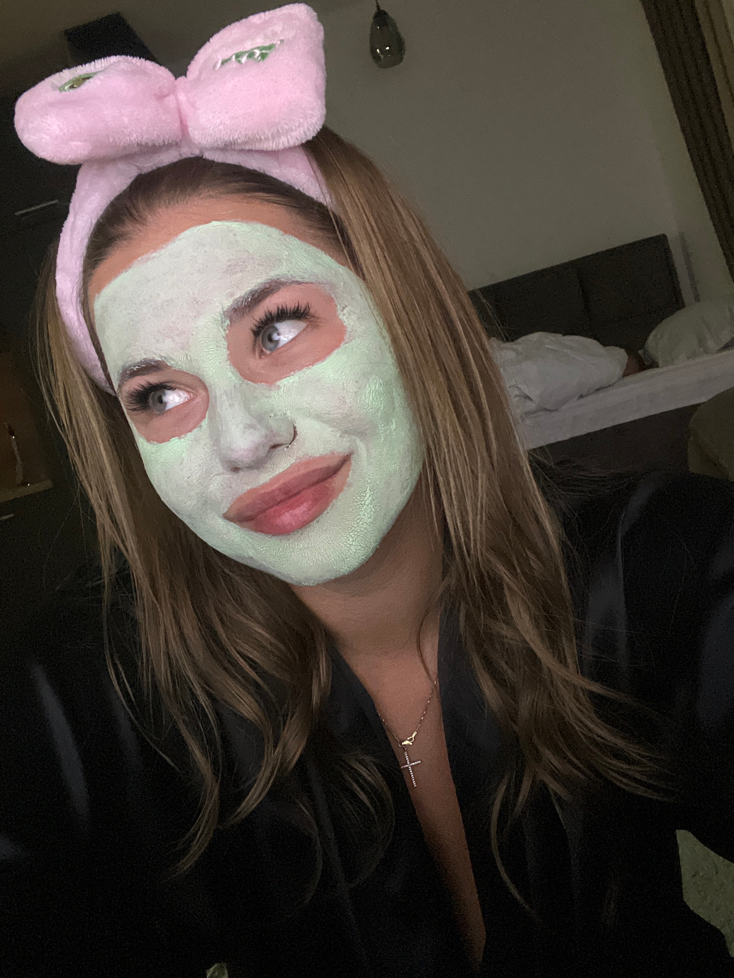 A young woman with long brown hair is lying down, wearing a light green facial mask and a pink headband with a bow. She has fair skin, visible greyish-blue eyes, and pink lips. A gold necklace with aβ¦read more