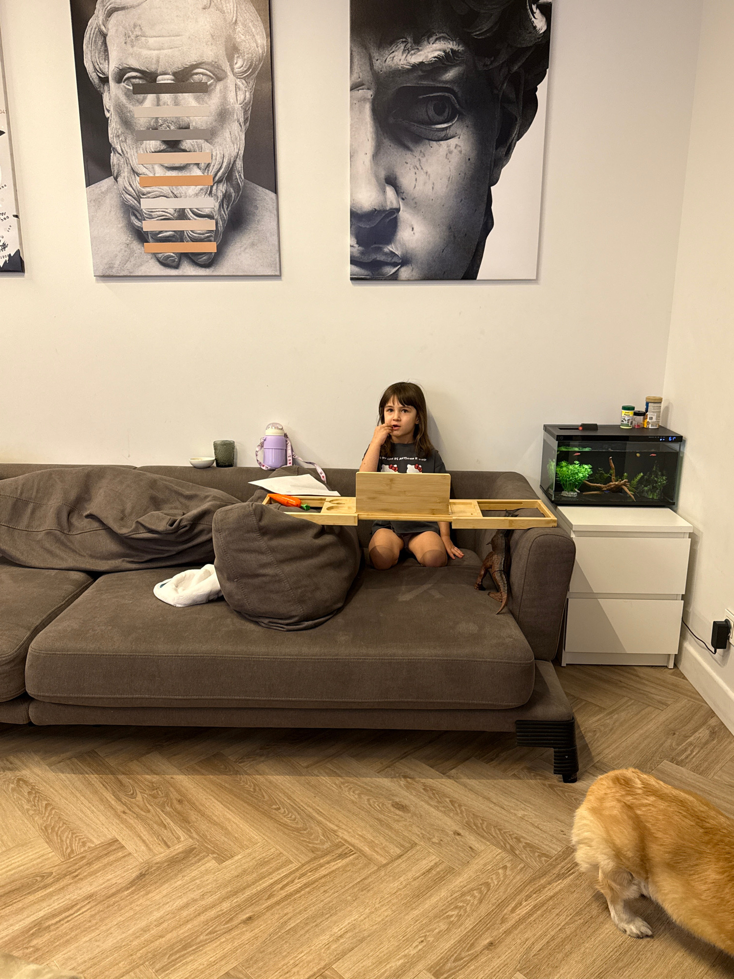 A girl sits on a brown couch in a room with light wood herringbone floors. A brown dog is visible in the upper right corner. A fish tank sits on a white cabinet near the couch. A wooden desk stands ov…read more