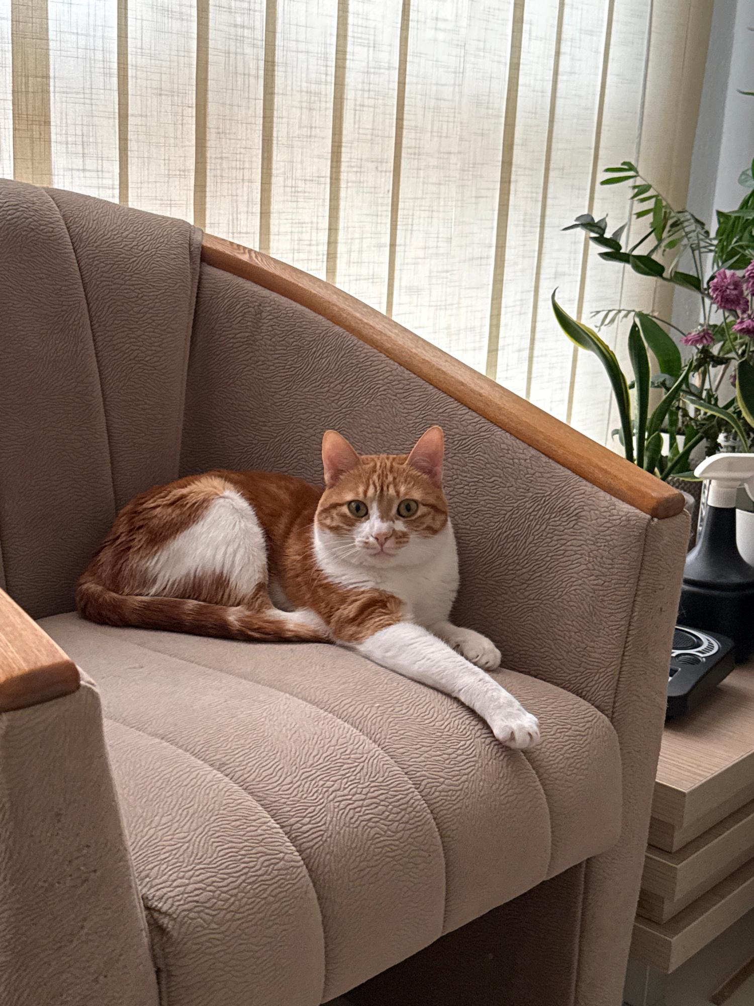 A ginger and white cat lies on the tan, textured cushion of an armchair. The cat is curled and looking towards the camera. Its left paw is extended towards the top right of the frame. The armchair has…read more