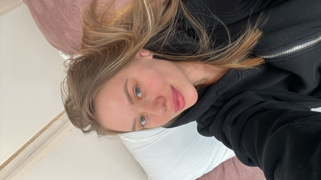 A woman with light brown hair is standing in a room. She is wearing a white long-sleeved shirt and black leggings. She is holding a smartphone in her right hand, as if taking a selfie. The background…read more