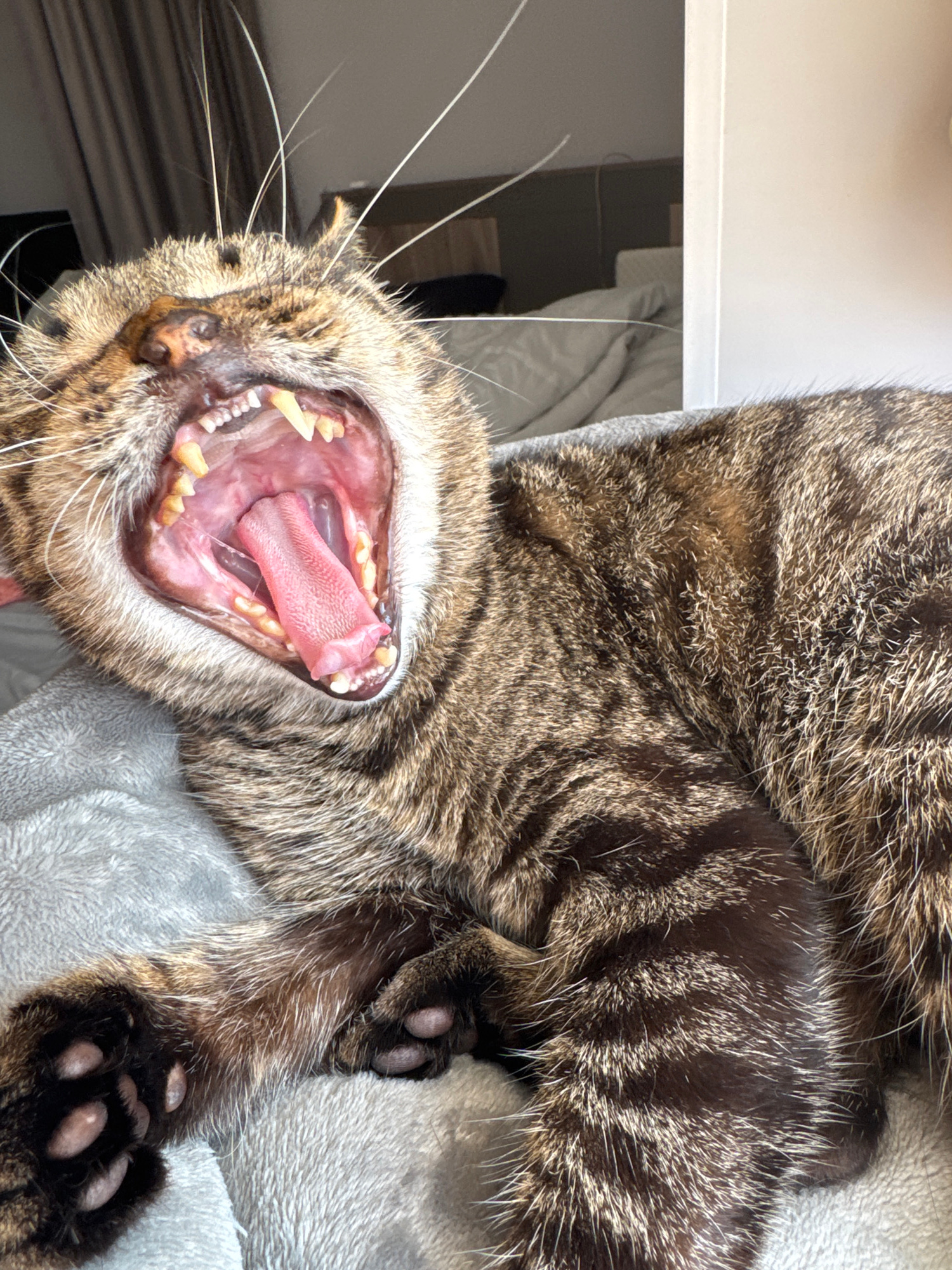 A brown tabby cat is lying on a light gray blanket, with its head tilted upwards and its mouth open in a wide yawn. The cat's pink tongue is visible, along with its teeth. The cat has black paw pads.…read more