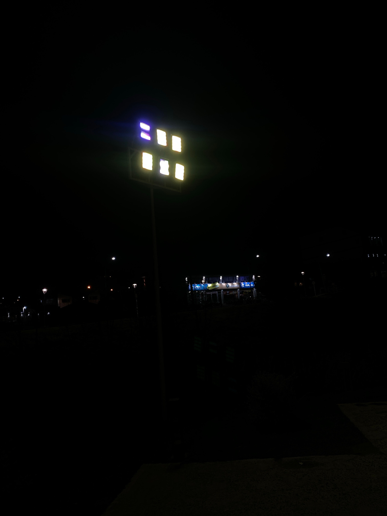 The image depicts a night scene in Ushuaia, Argentina. A bright rectangular LED street light, with a matrix of individual lights, illuminates the foreground from the left. The upper right is notably d…read more