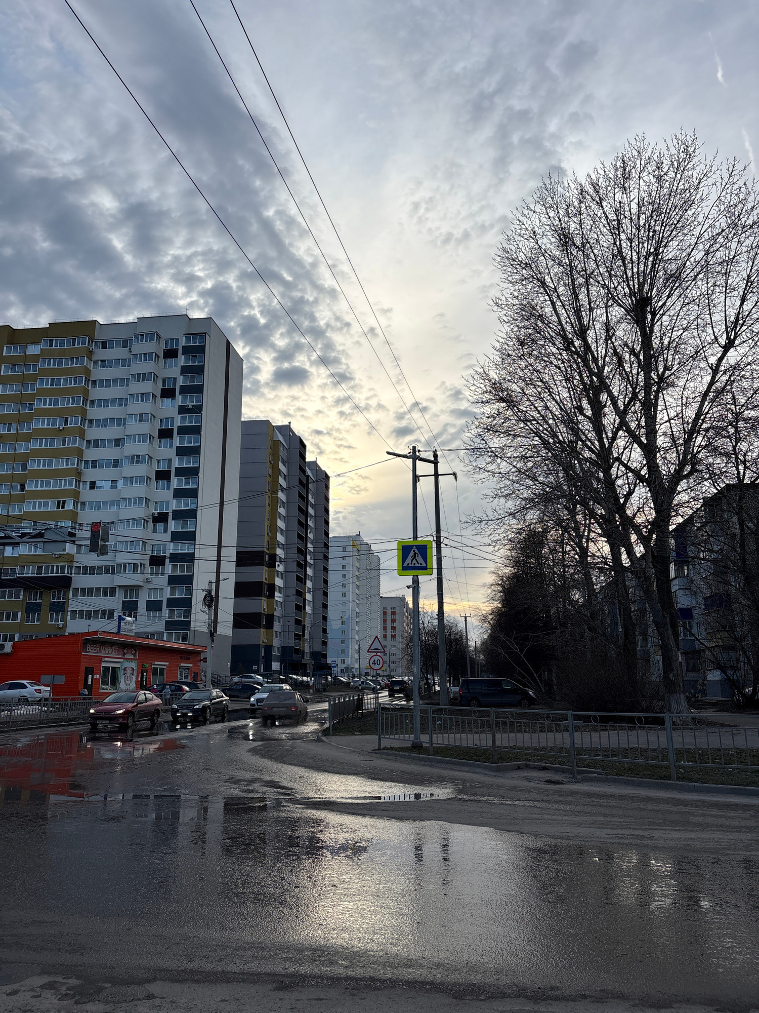 A slightly rotated street scene in Ulyanovsk, Russia, likely after rainfall, shows a wet asphalt road reflecting the sky. The foreground features a sidewalk separated from the road by a metal fence. A…read more