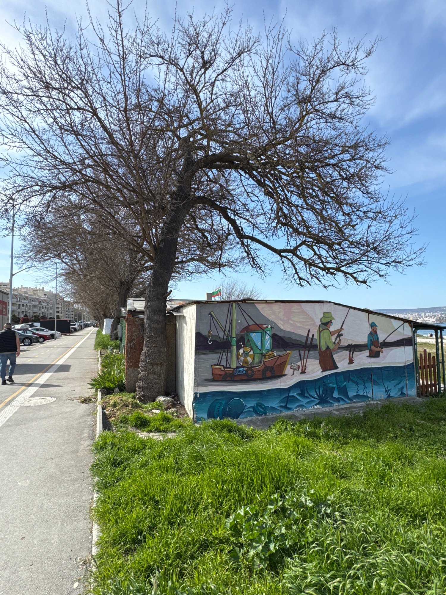 The image captures a vibrant daytime street scene in Varna, Bulgaria, characterized by a large, bare deciduous tree on the left, a colorful mural on a building wall to the right, and a paved road withβ¦read more