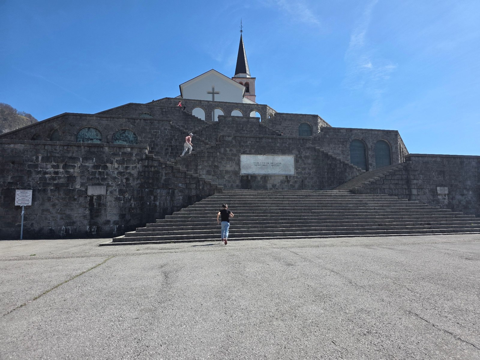 The image shows a young person running up a long staircase towards a church in Mlinsko, Slovenia. The church, white with a black steeple, sits atop a large stone structure with multiple levels and arc…read more