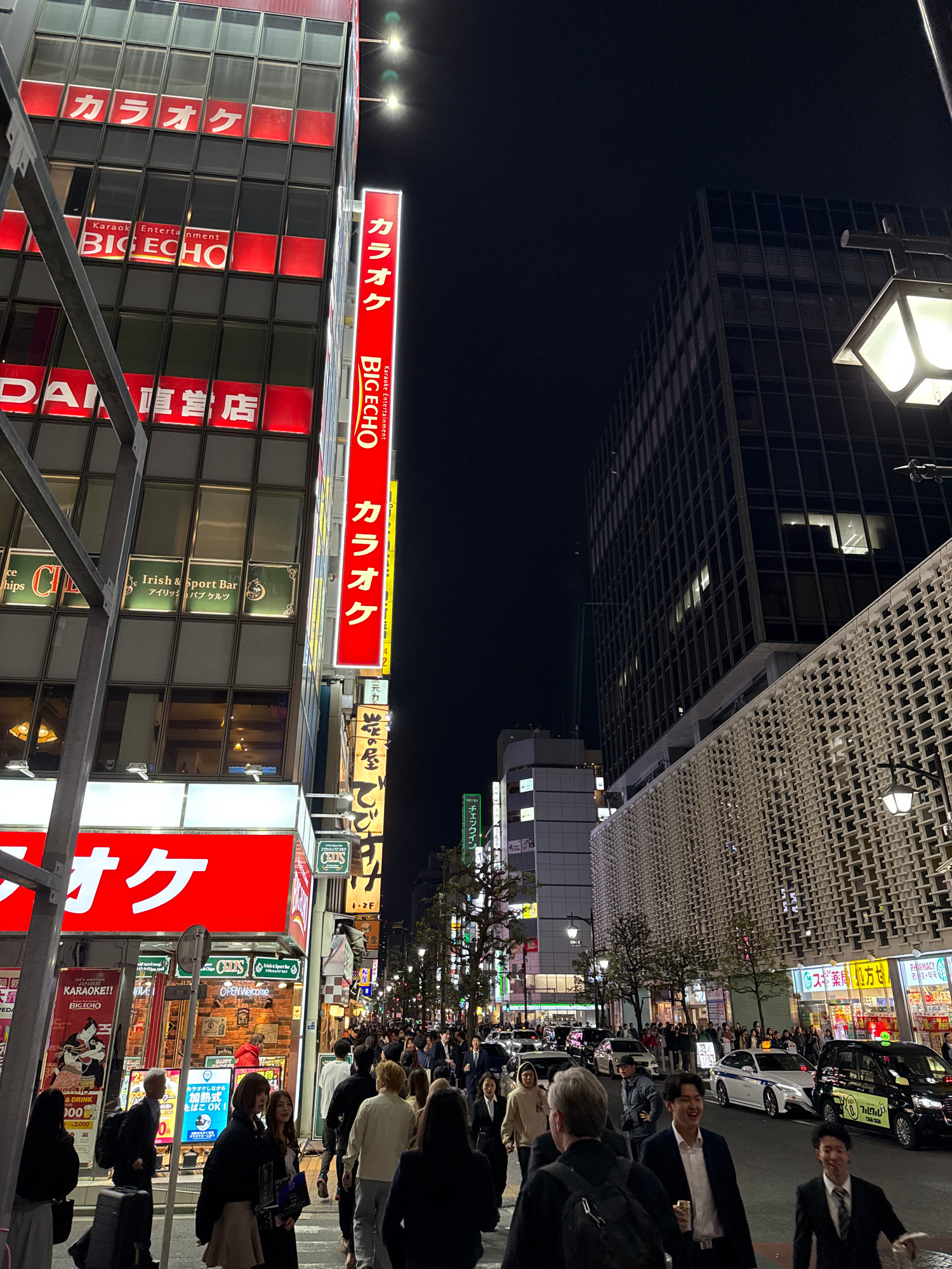 The image captures a vibrant night scene on a bustling city street in Minato, Japan. The time of day is clearly night, with the sky completely dark and the area brilliantly illuminated by numerous com…read more