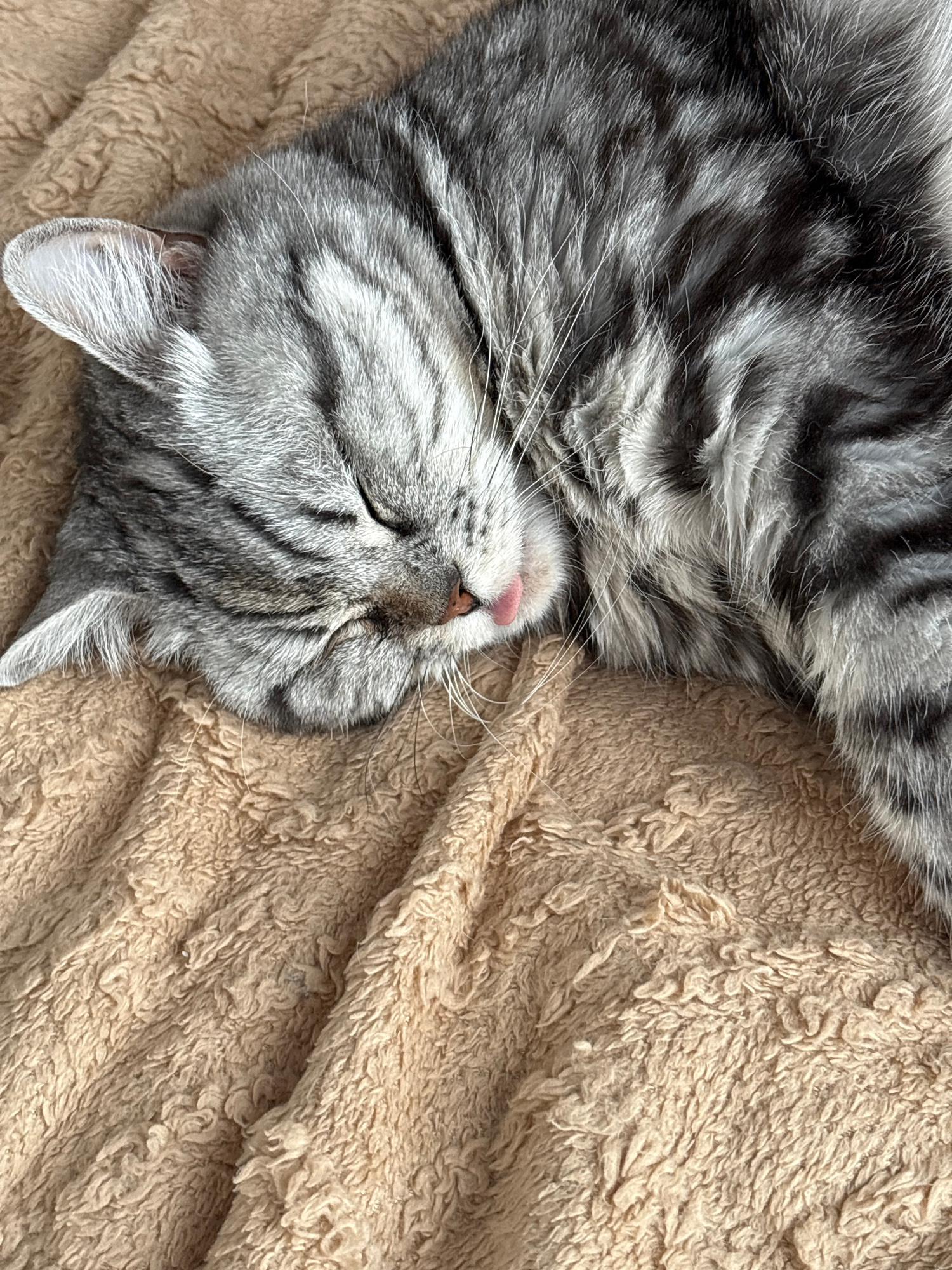 A grey tabby cat is lying on a tan blanket. The cat is on its side with its eyes closed. A small portion of its pink tongue is visible. The cat appears to be sleeping. The location is not possible to…read more