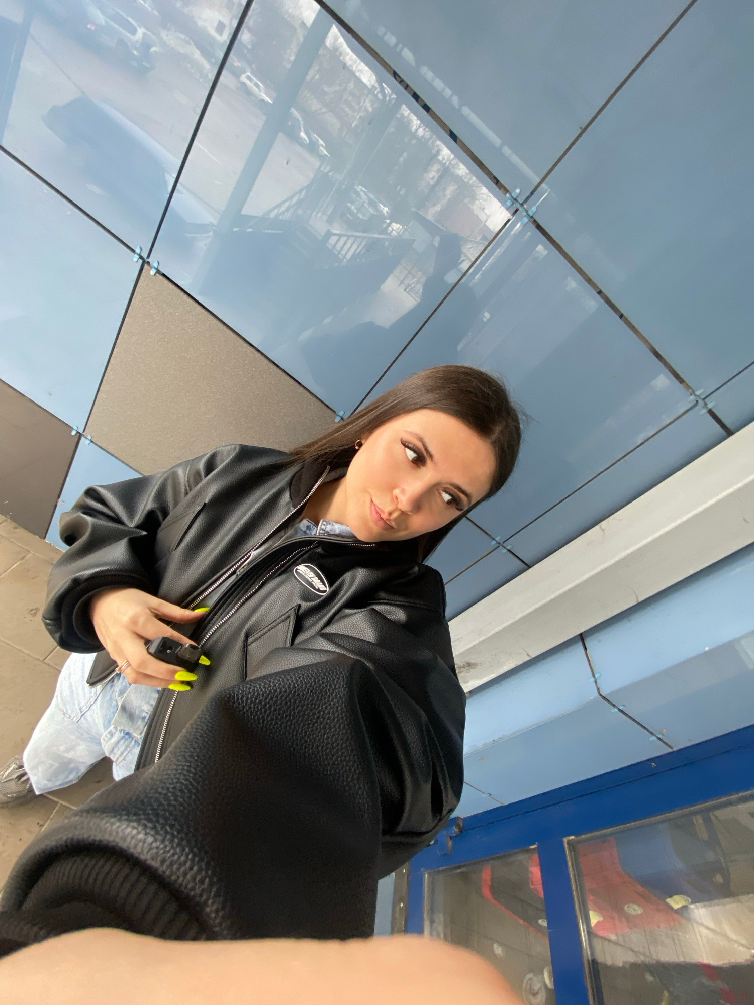 A young woman with dark hair and olive skin, wearing a black leather jacket and jeans, is standing under a tiled blue and grey ceiling, possibly in a public space in the city of Chaikovsky, Russia. Th…read more