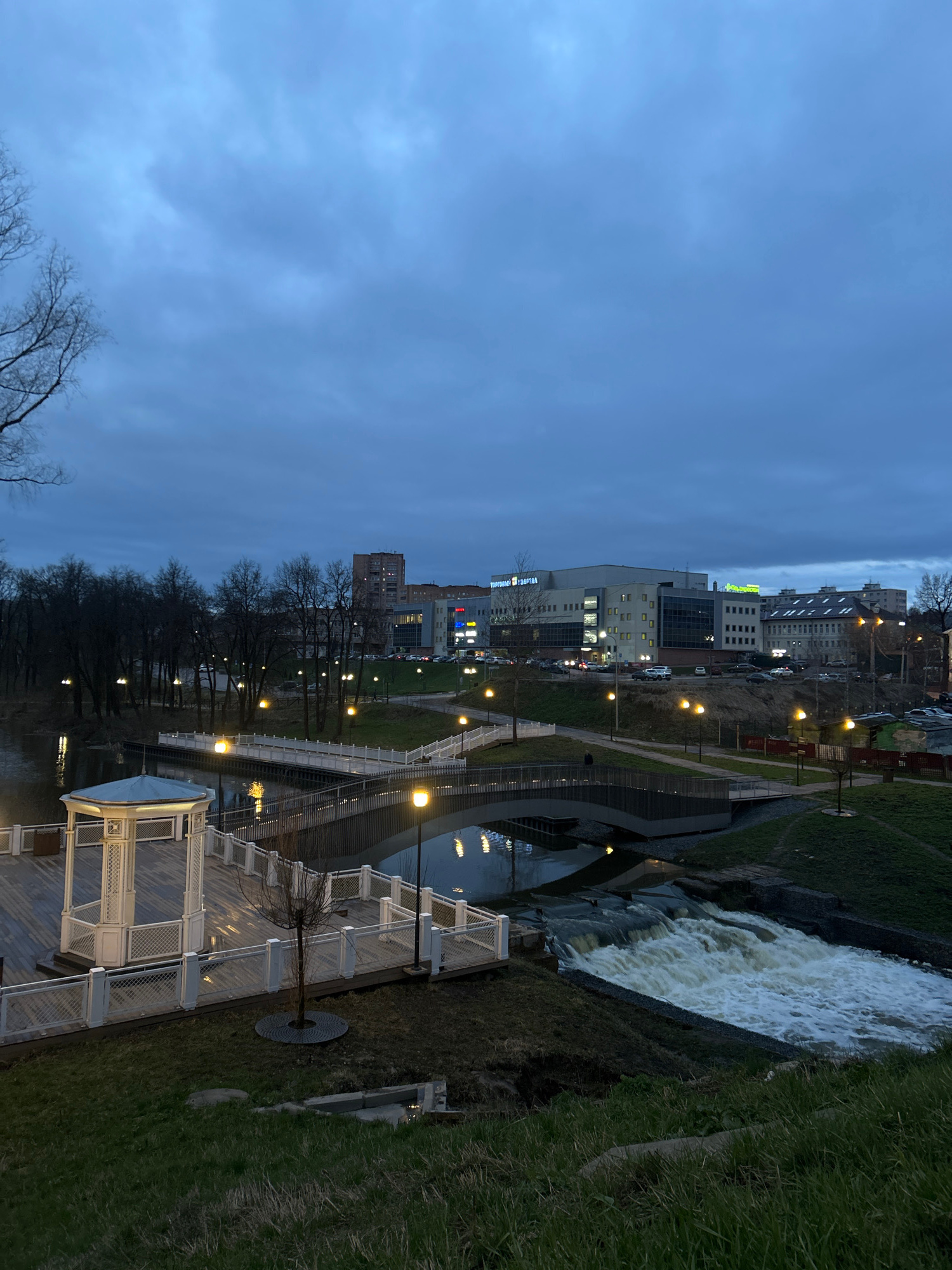 The image depicts a view of Klin, Russia, captured at dusk or twilight. The urban landscape is dominated by a river and a cascading waterfall on the right side of the frame. A pedestrian walkway with…read more