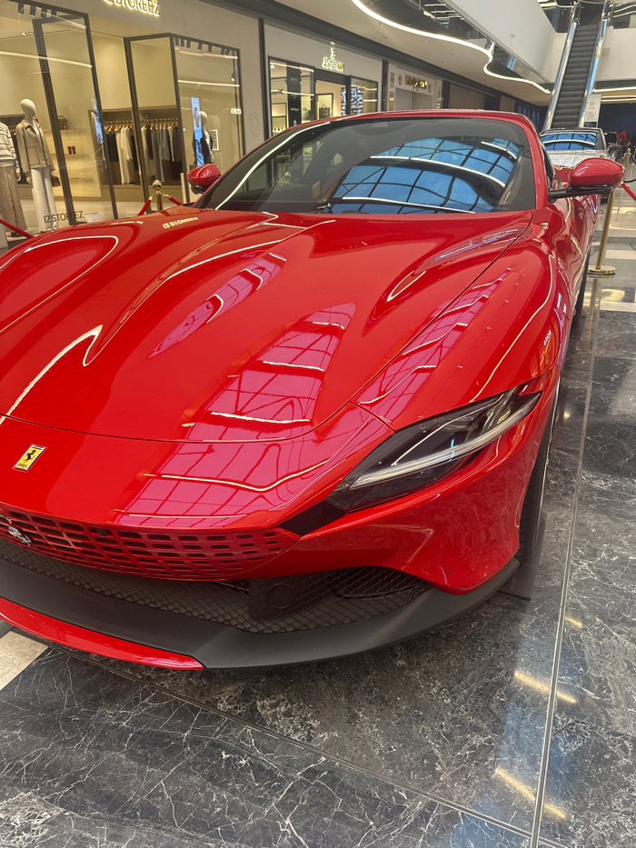 A red Ferrari Roma sports car is prominently displayed on a dark, polished, veined floor within a modern, multi-level indoor shopping mall in Tashkent, Uzbekistan. The vehicle's front section, includi…read more