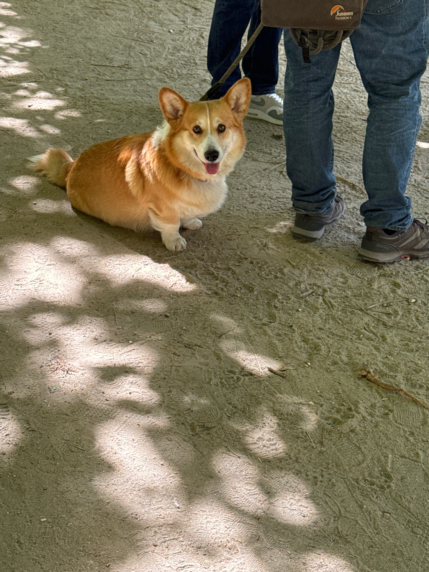 An overhead shot captures the lower half of a person and a Corgi on a sunny outdoor path, likely in a park in Paris, France. The person wears blue jeans and brown hiking shoes, with a dark brown utili…read more