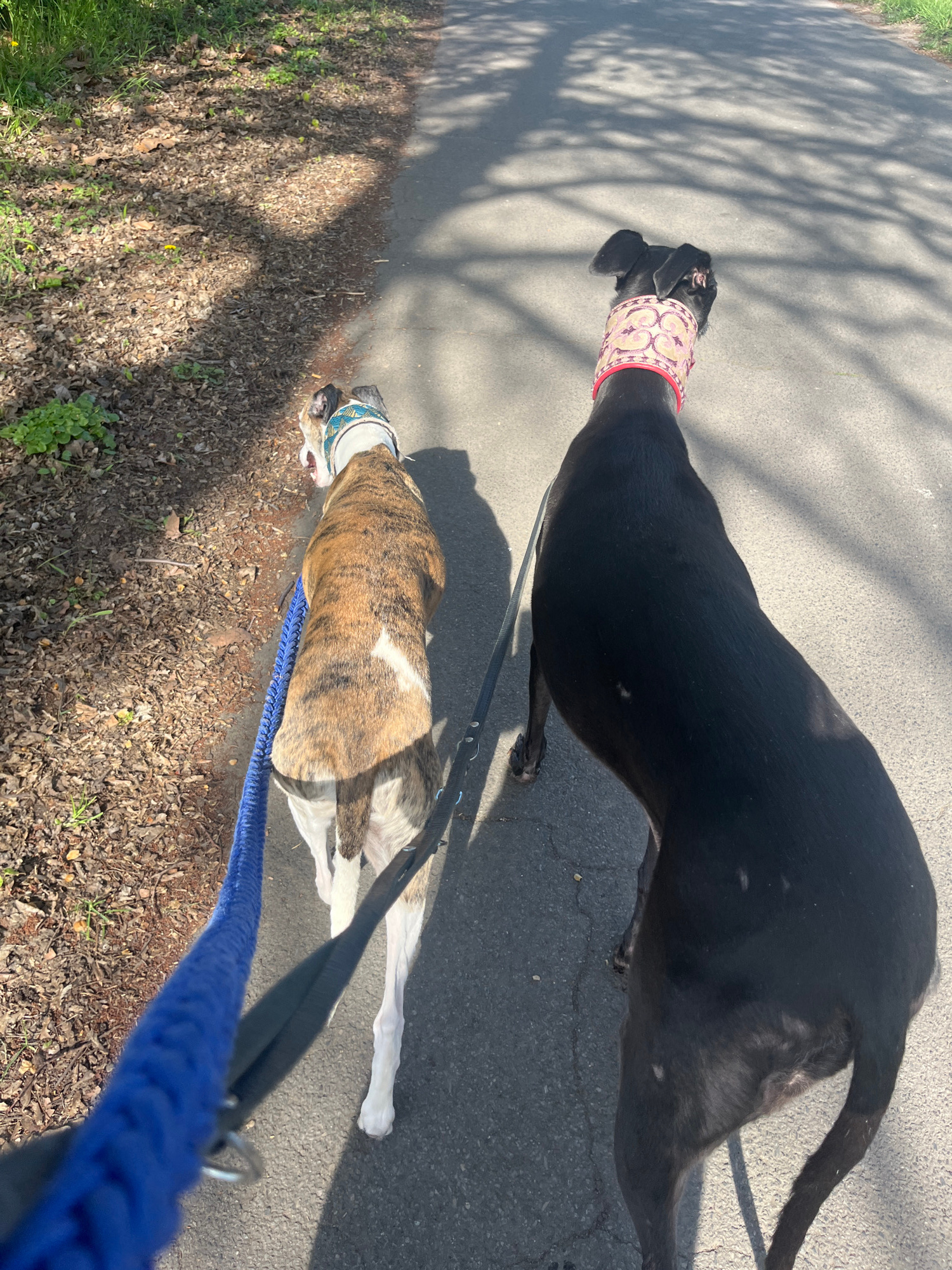 The image depicts two dogs walking on a paved path, possibly in Konz, Germany, given the prompt's instructions. A black dog with a patterned collar is in the foreground, slightly ahead of a brindle an…read more