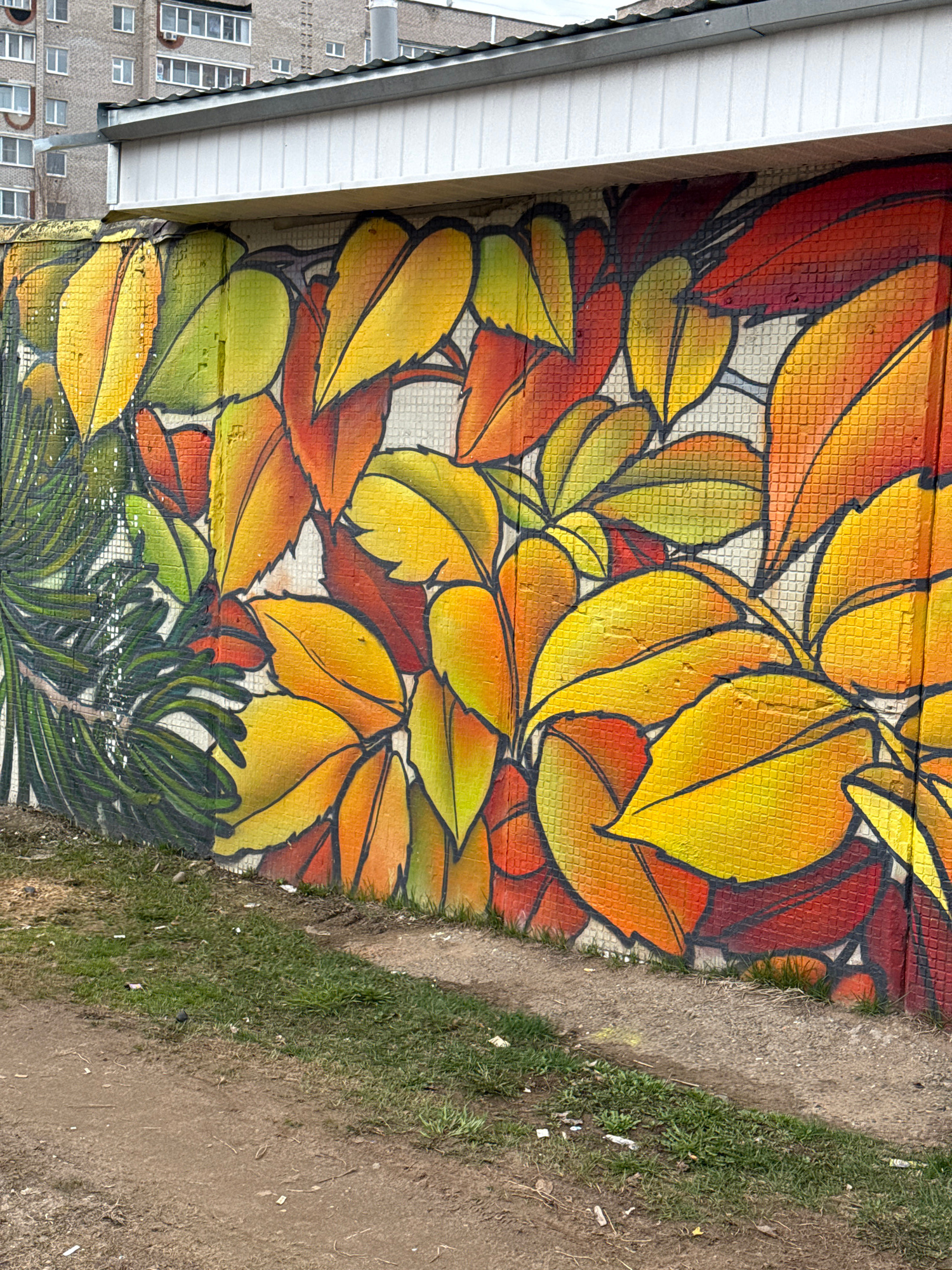The image depicts a mural of autumn leaves painted on a wall. The leaves are primarily yellow, orange, and red, with black outlines. The mural appears to be on a tiled wall, and a white building is ad…read more