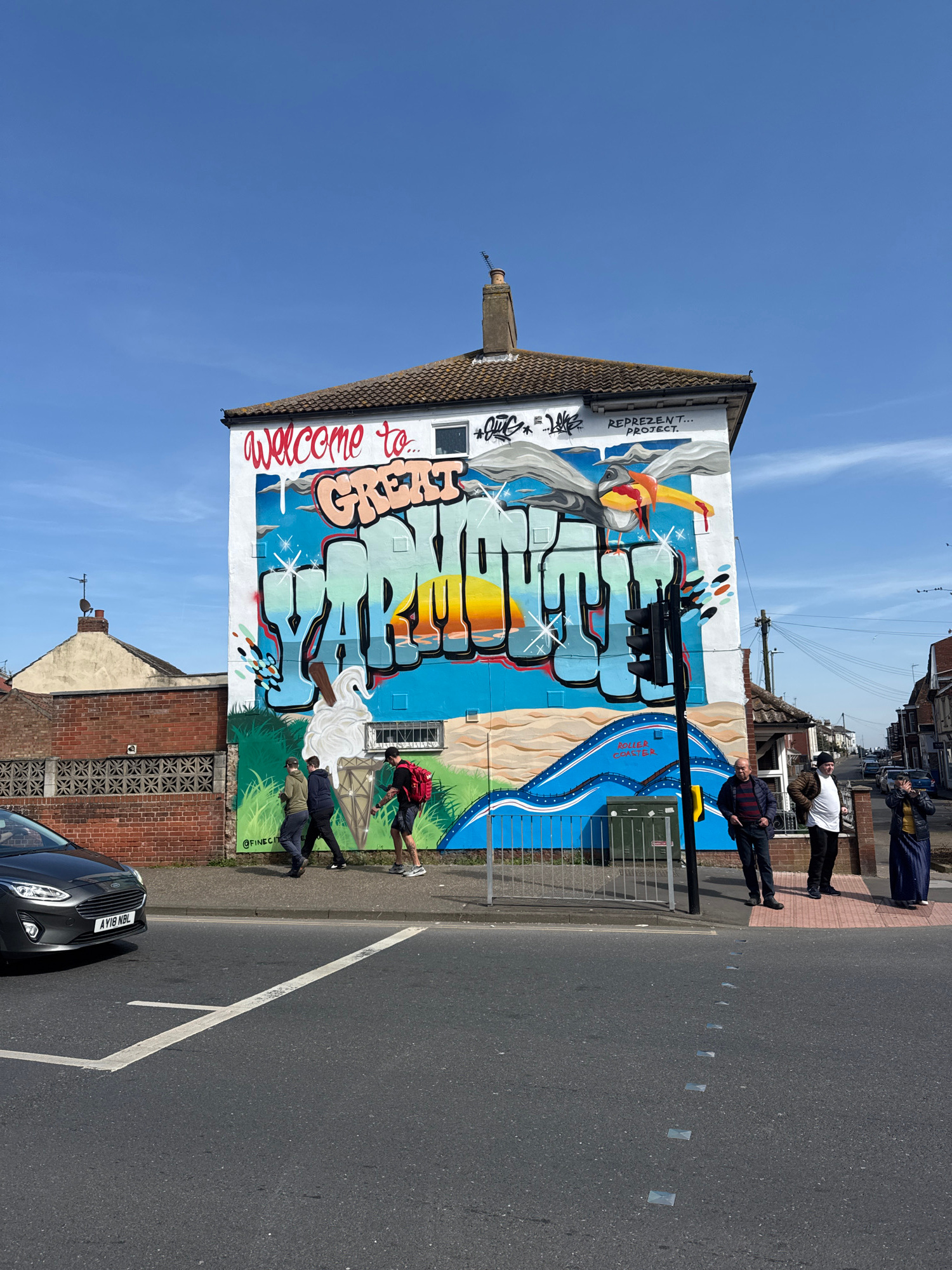 The image shows a street scene in Great Yarmouth, United Kingdom. A tall building is prominently featured, its side entirely covered in a large, colorful mural. The mural includes the words "Welcome t…read more