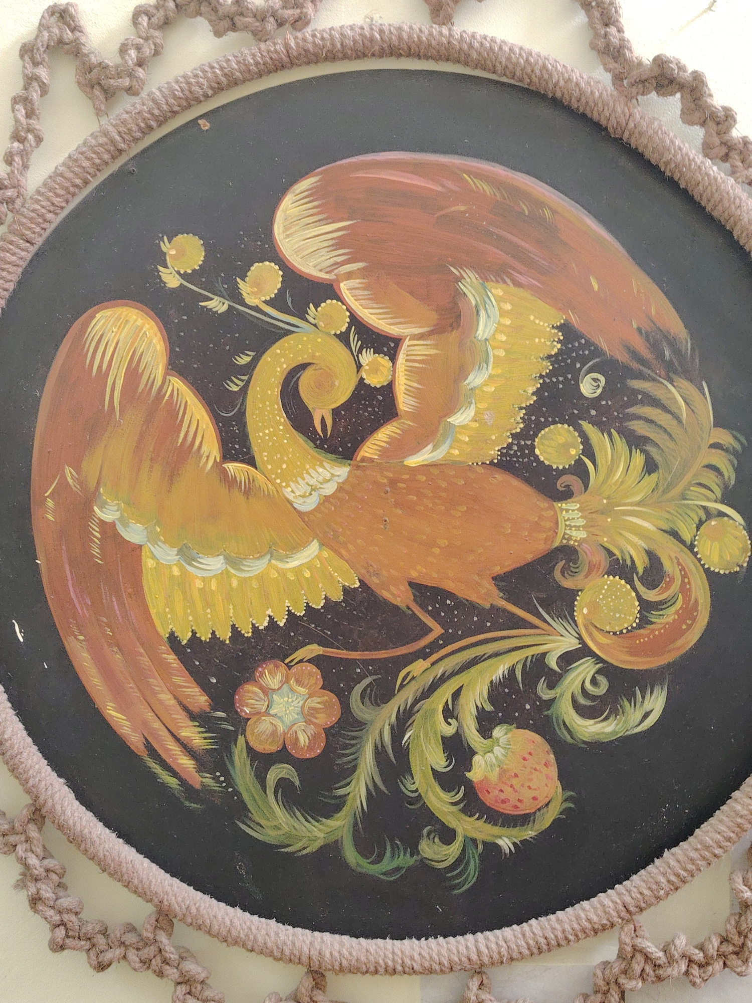 A close-up captures a round, dark lacquered tray or plate with a vibrant, folk-art style painting. The central motif is a stylized bird, reminiscent of a phoenix, with swirling golden and orange pluma…read more