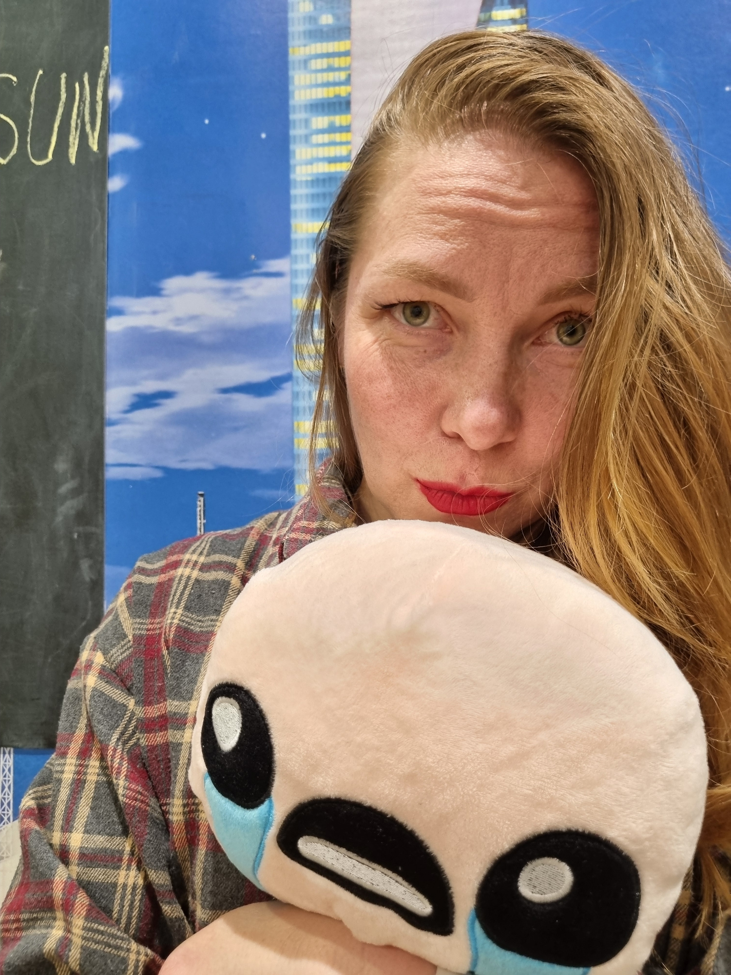 A woman is holding a plush toy against a backdrop with an image of skyscrapers and a cloudy blue sky. She has fair skin, reddish-blonde hair, and green eyes, and is wearing red lipstick. Her expressio…read more