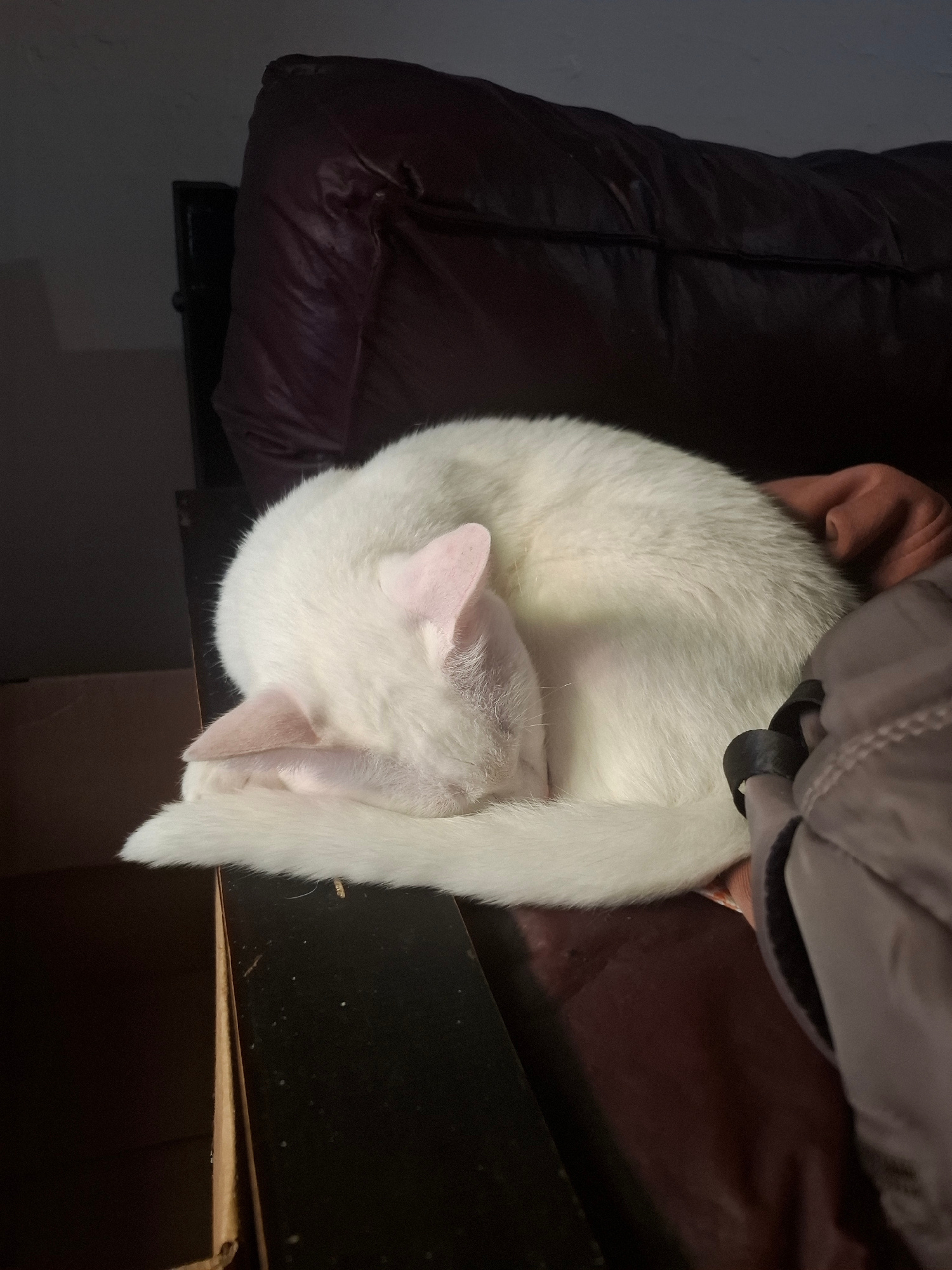 A medium indoor shot captures a white cat grooming itself on a burgundy-colored couch. The cat is positioned centrally in the frame, its body curled into a ball with its tail raised and bent towards i…read more
