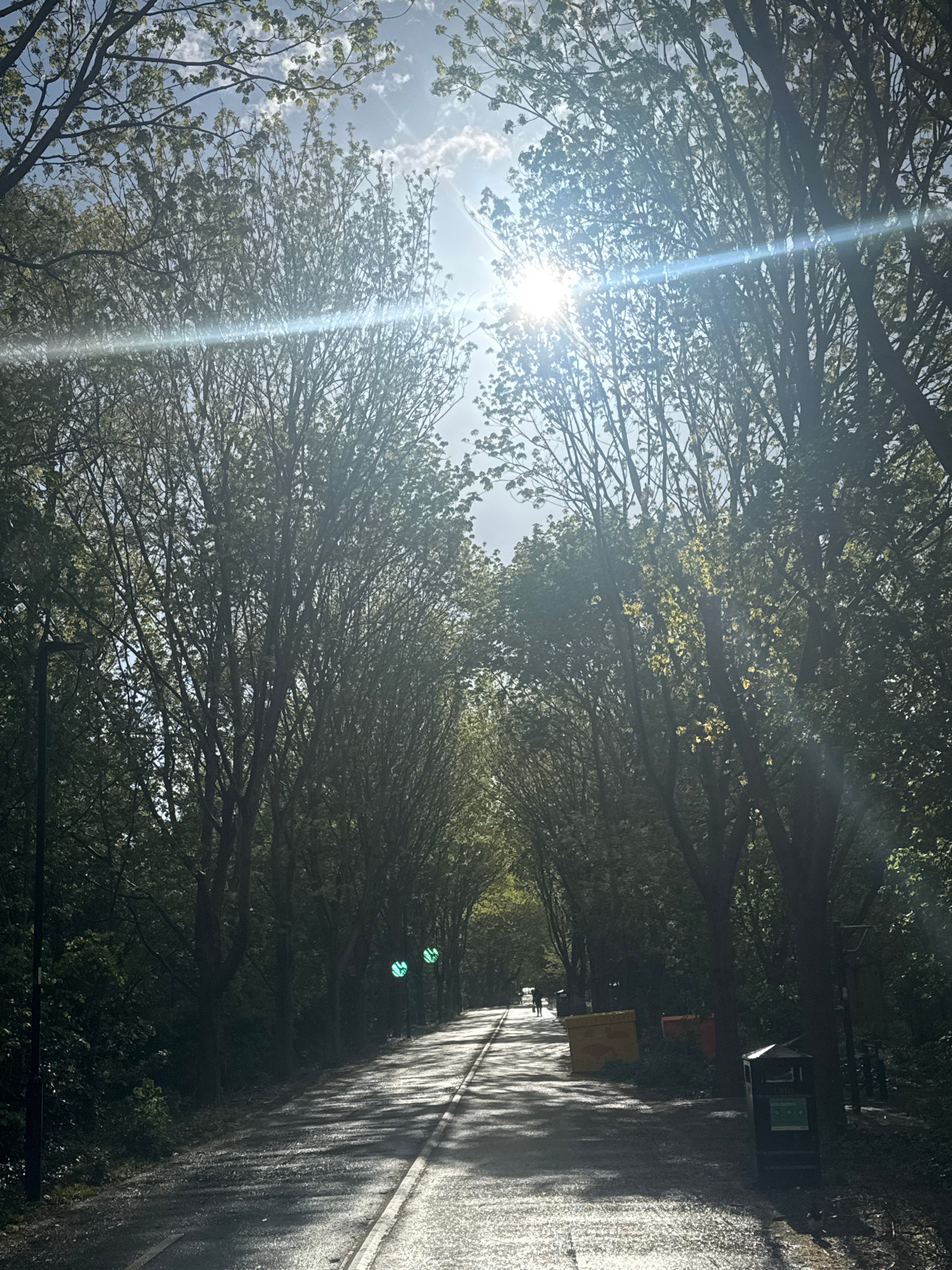 The image depicts a tree-lined road in daylight. Sunlight shines through the branches, creating bright flares and shadows. The road surface appears wet, reflecting light. There is a bin and some roadβ¦read more