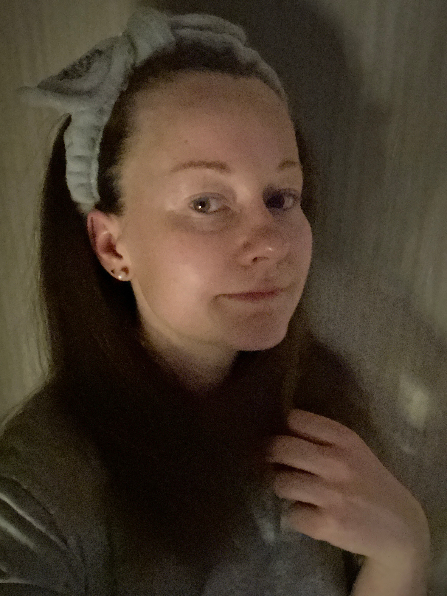 A woman with fair skin and brown hair is lying down, facing the camera. She is wearing a gray, plush headband. Her right hand is visible near her hair. The background appears to be a gray surface. The…read more