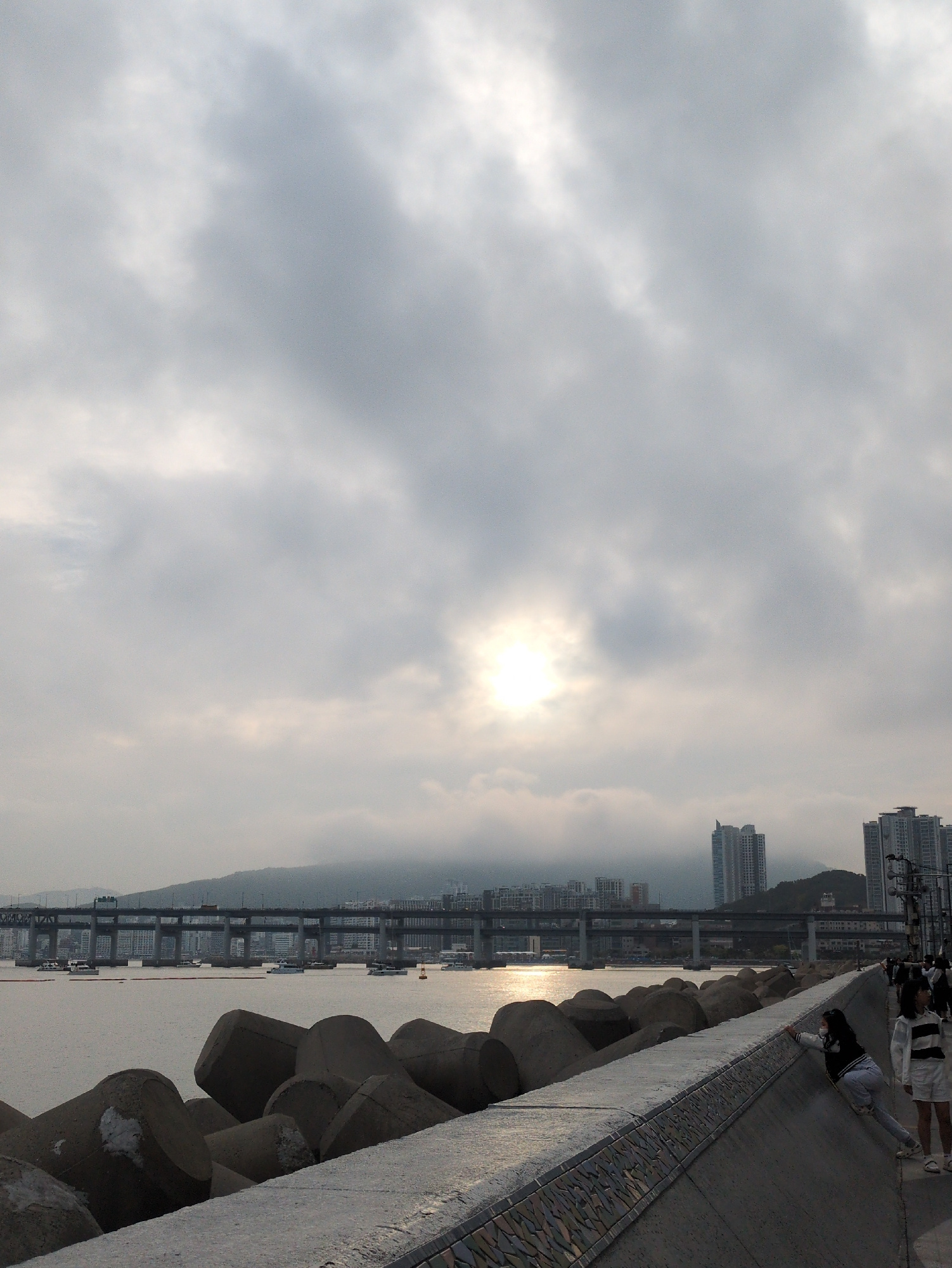 This is a landscape image taken in the city of Busan, South Korea. The sky is filled with gray, overcast clouds with the sun shining through, creating a diffused light. Below the clouds is the city sk…read more