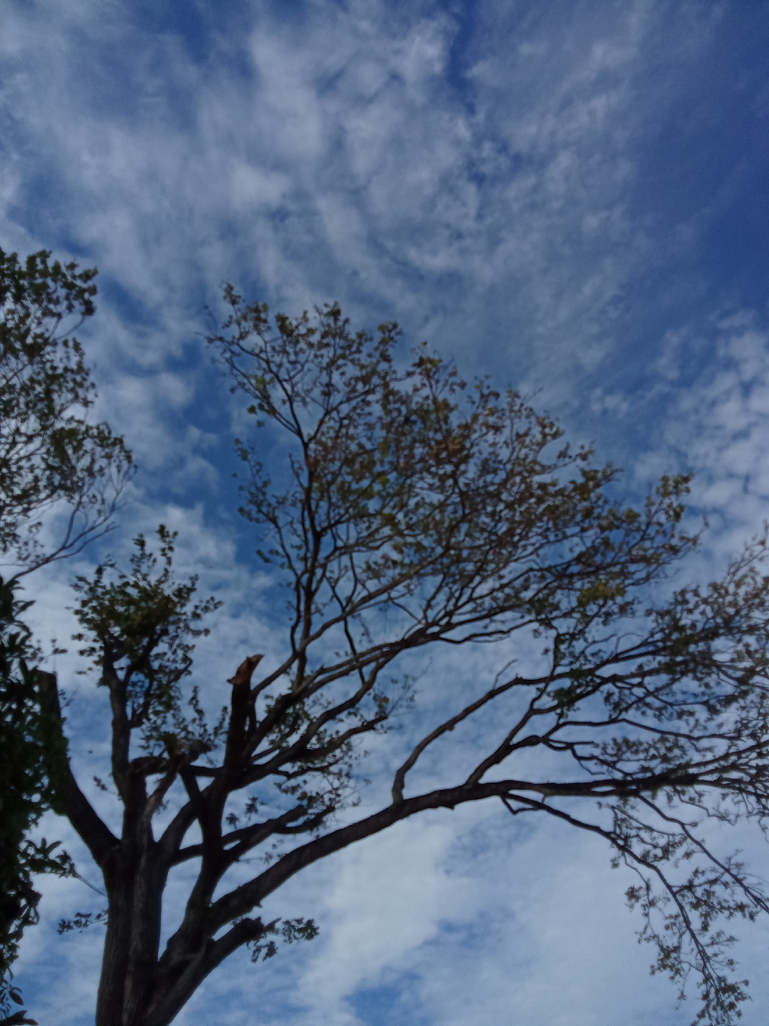 The photograph, likely taken in Juan Griego, Venezuela, depicts a view looking up towards the sky. The sky is a deep blue color, punctuated by streaks of white, wispy clouds. In the foreground, the si…read more