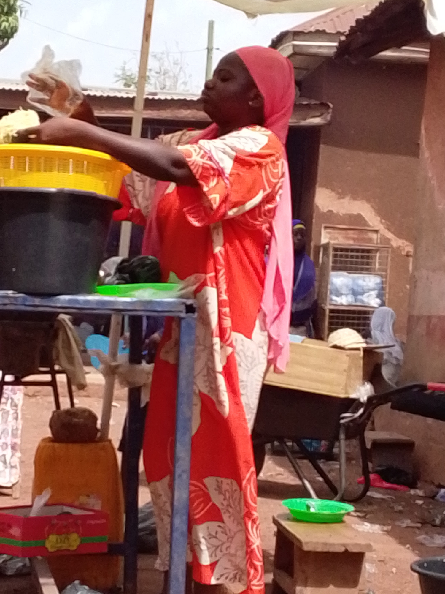 In Tamale, Ghana, a woman wearing a red floral dress and a pink headscarf stands at a makeshift outdoor food stall. She is reaching into a yellow container with her left hand, which is covered by a pl…read more