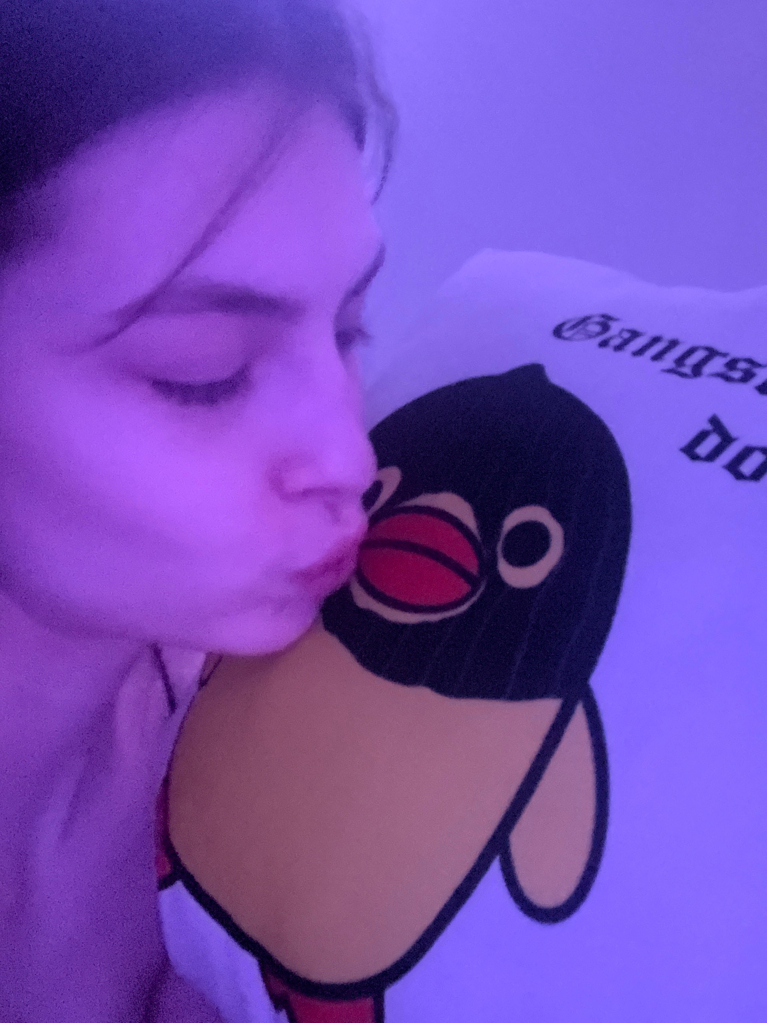 A person lies in bed with their eyes closed, face partially obscured by a Pingu plush pillow. The pillow features a black and yellow Pingu character with a red beak and the word "Gangster" printed abo…read more