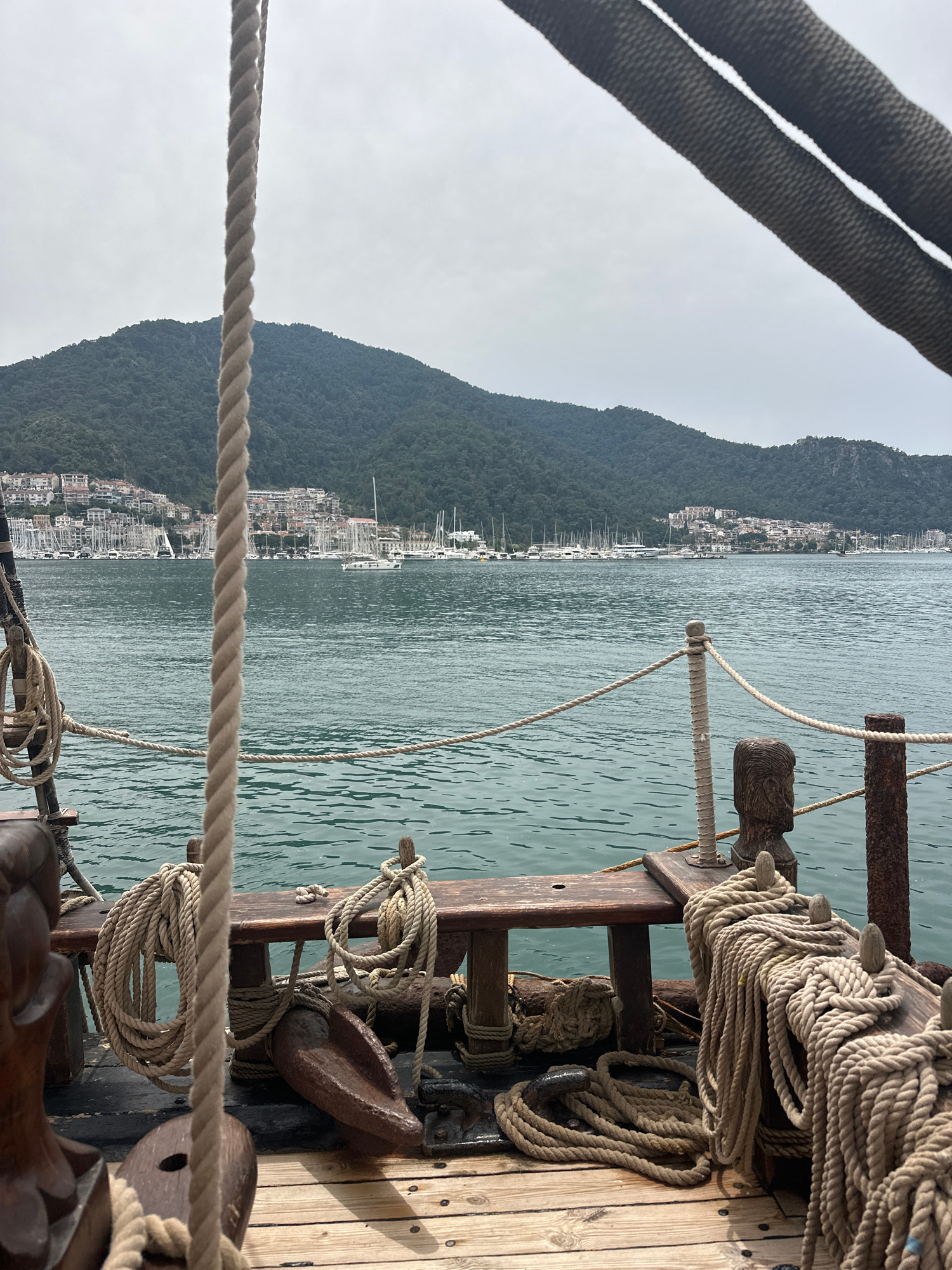 The image depicts a view from a boat, likely a traditional wooden sailing vessel, situated in the harbor of Fethiye, Turkey. The foreground is dominated by the boat's rigging, including thick ropes an…read more