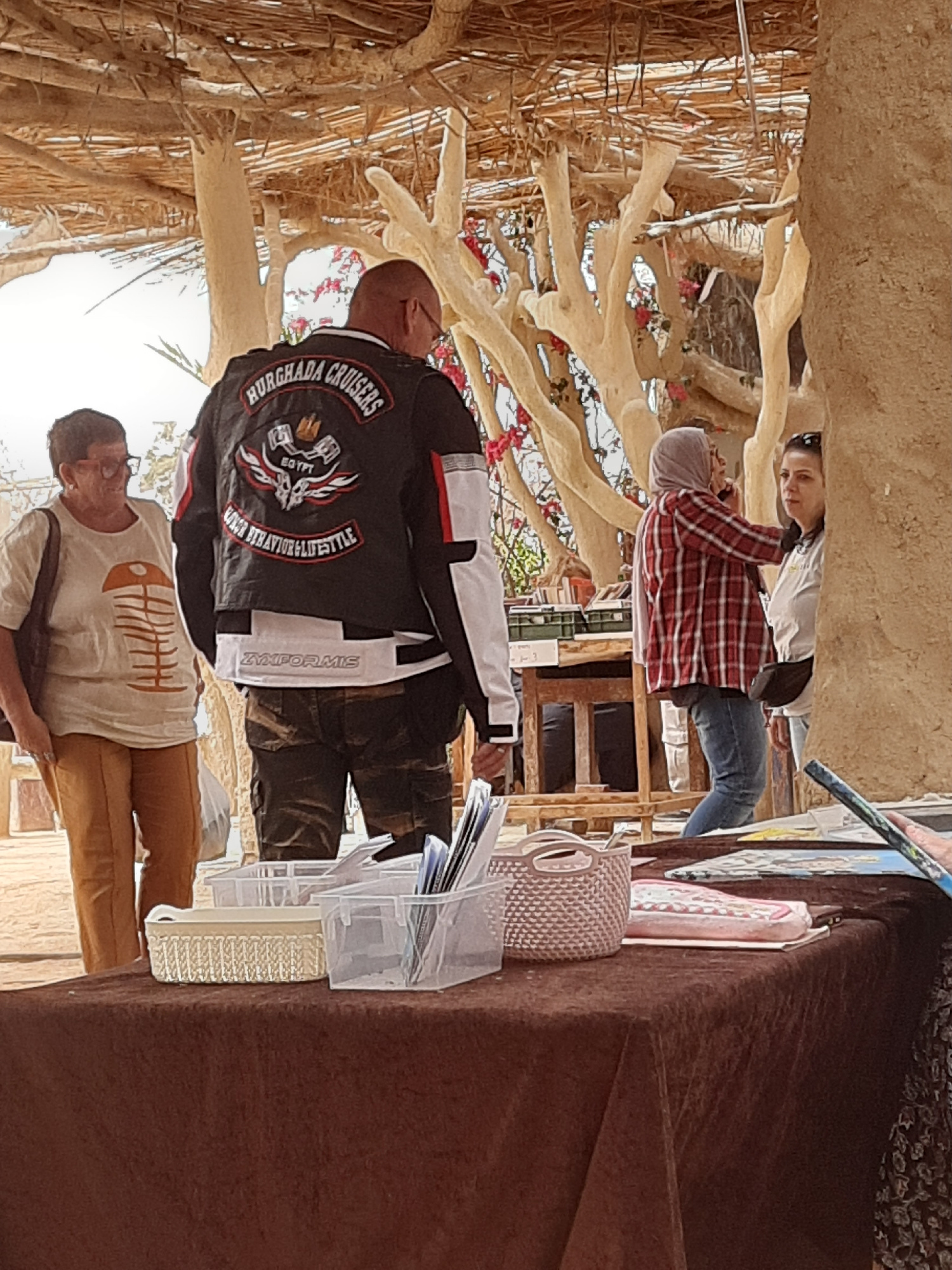 The image captures an outdoor scene in what appears to be a market or bazaar in Hurghada, Egypt. The picture is oriented sideways. The setting includes natural structures like branches or wooden poles…read more