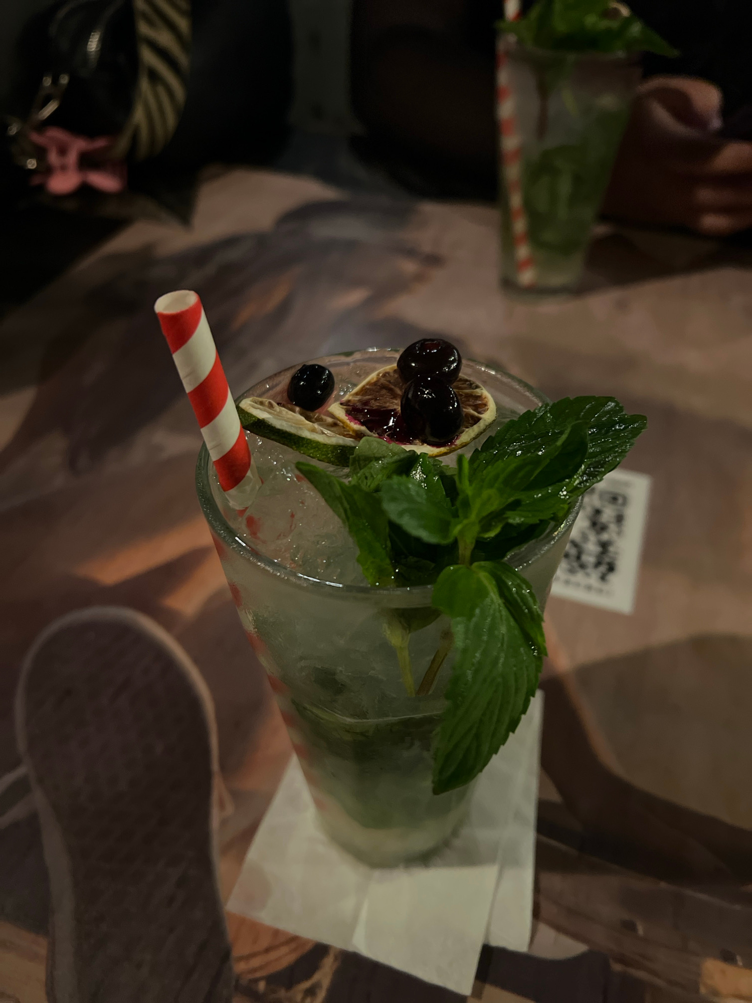 A close-up shot shows a glass of mojito positioned on a table. The mojito is garnished with mint leaves, a dried citrus slice, and dark cherries. A red and white striped straw is inserted in the glassβ¦read more