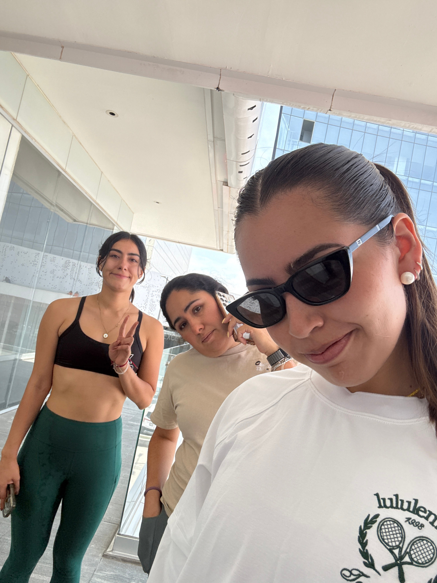 Three women are in the image. One woman is wearing sunglasses, a white shirt with a tennis emblem, and a watch. Another woman is wearing a beige shirt and is holding a phone. The third woman is wearin…read more
