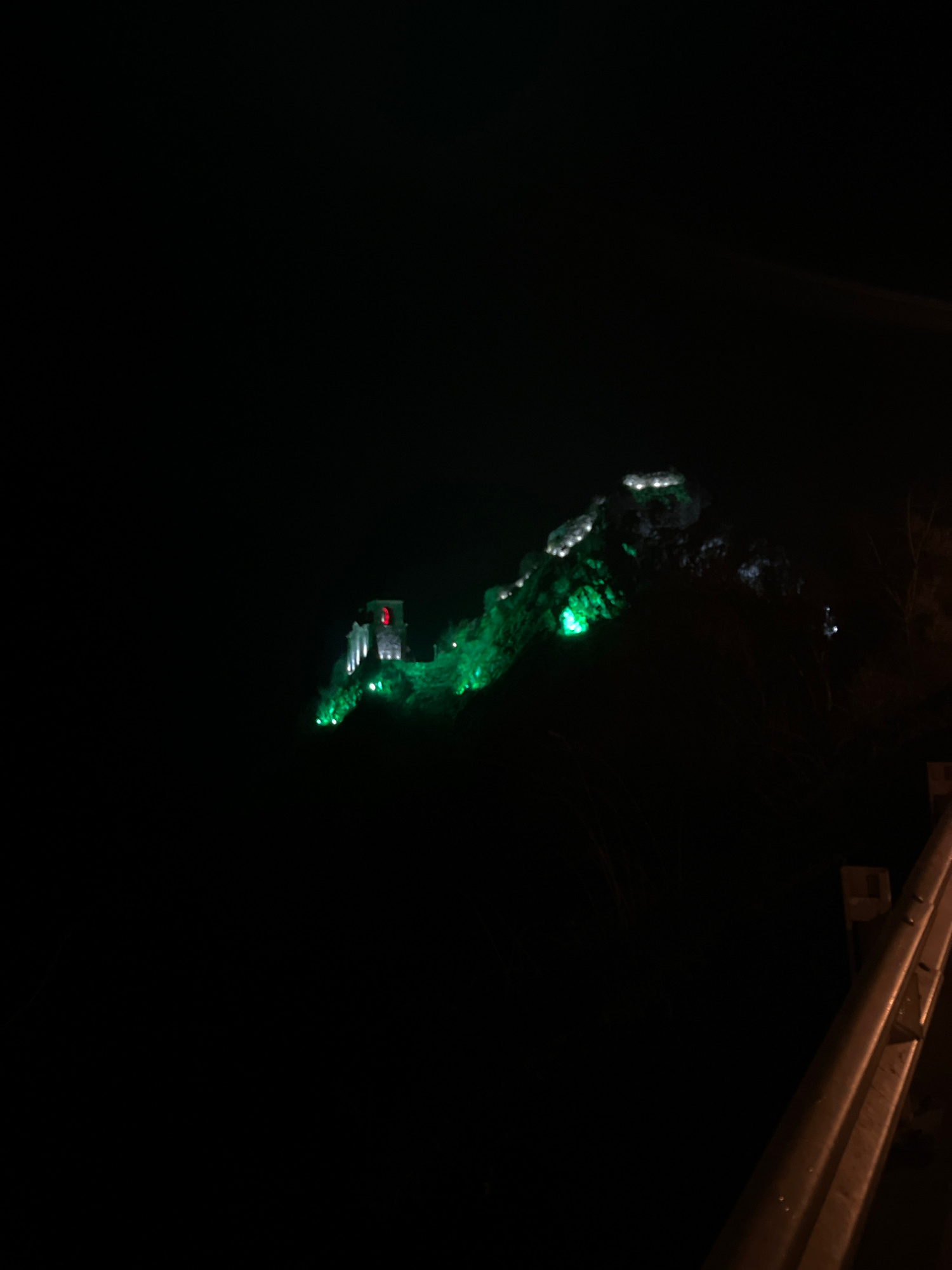 The image shows a nighttime view of a building and surrounding landscape illuminated with green and white lights. A road guardrail is visible in the upper right corner of the frame. The image appears…read more