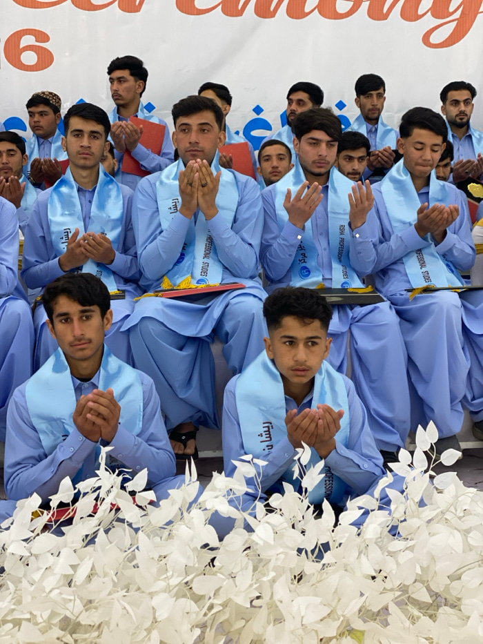 The image displays approximately twenty young men and male adolescents seated in rows at what appears to be a formal ceremony for Risha Professional Studies in Kandahar, Afghanistan. Each individual w…read more