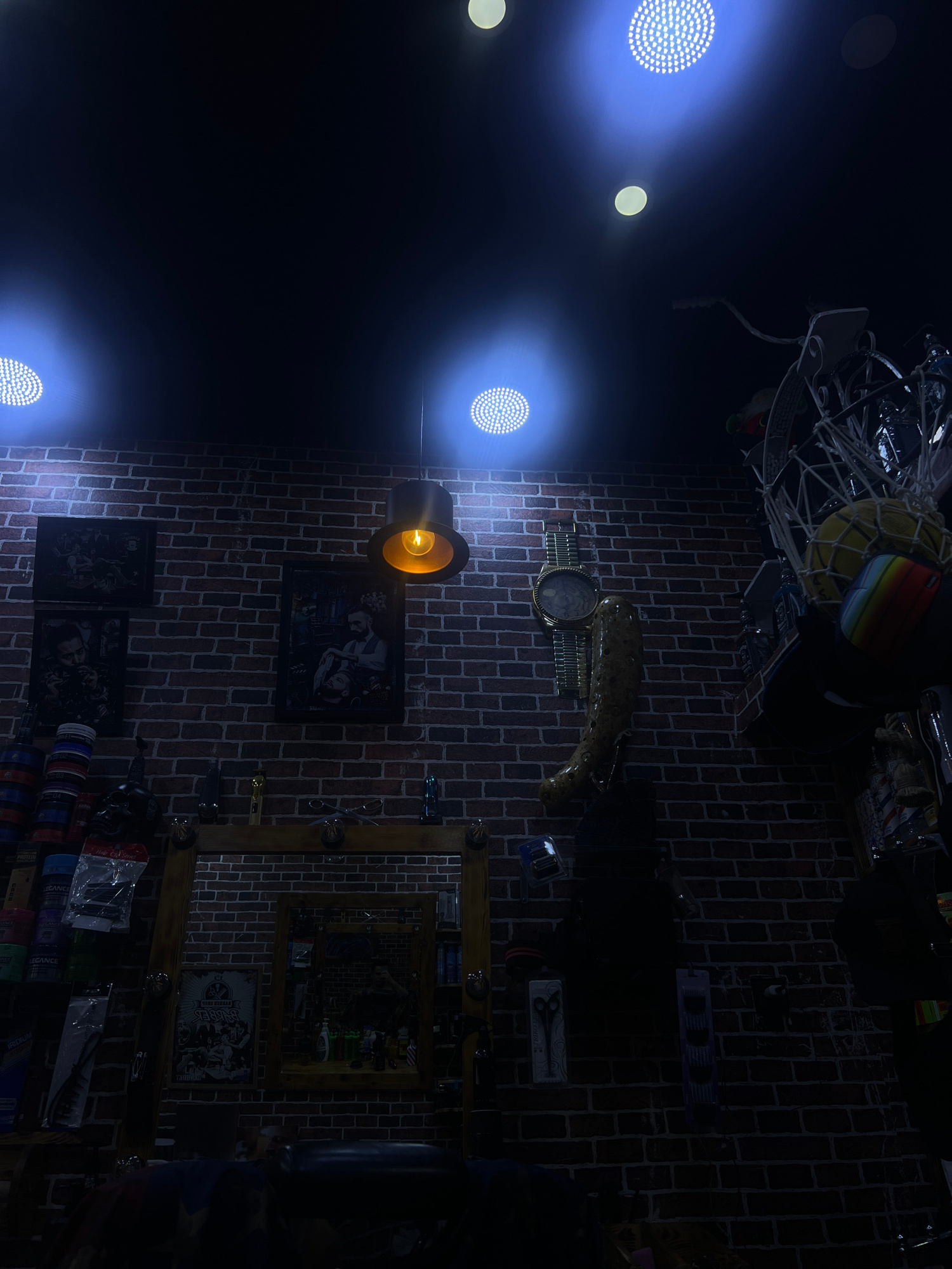 The image depicts the interior of a barber shop in Ouaouizert, Morocco. The walls are covered in dark red brick, adorned with framed pictures and miscellaneous barber-related items. A clock and other…read more