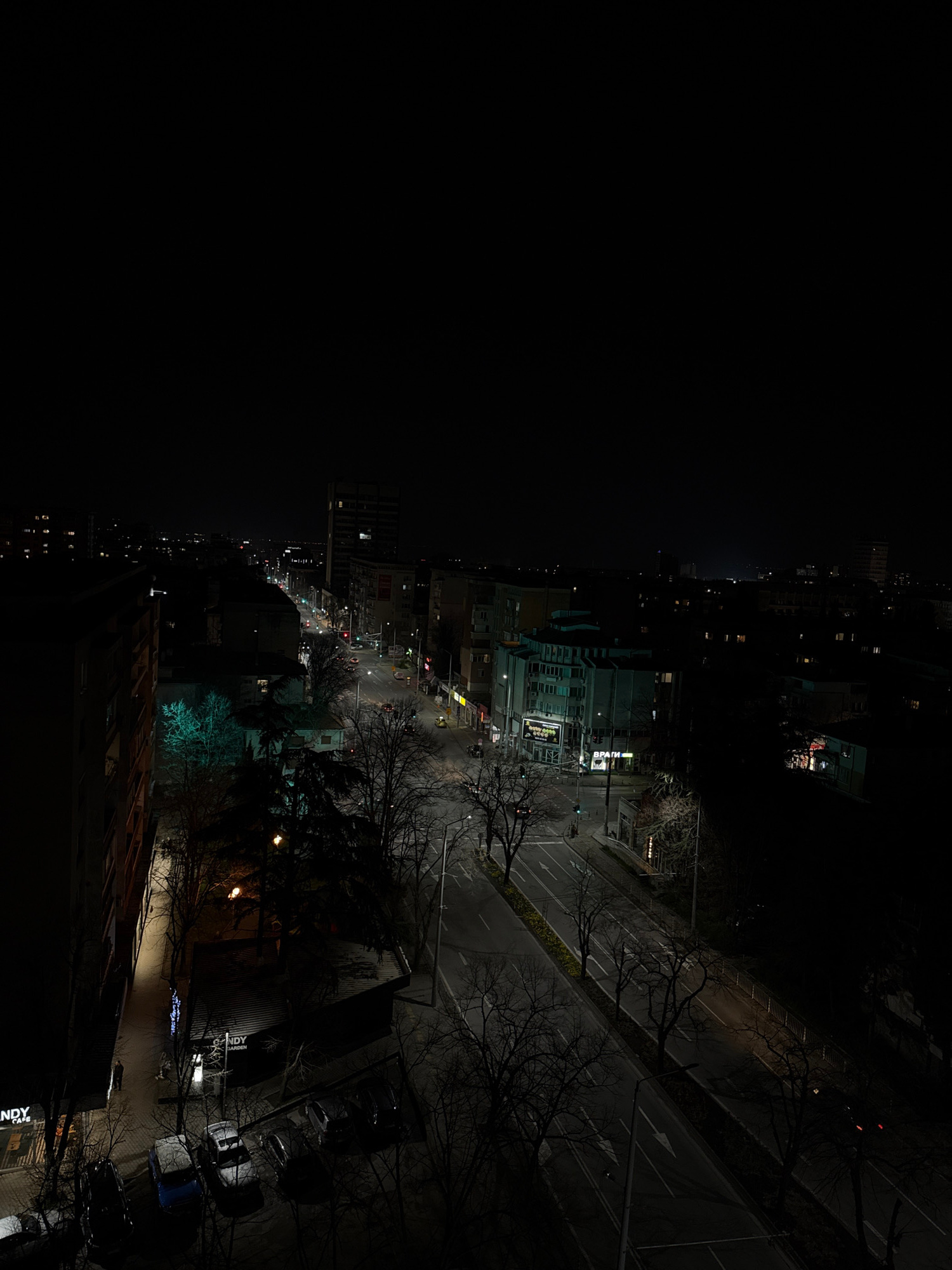 The image depicts a night scene in Stara Zagora, Bulgaria, viewed from an elevated position. The cityscape is illuminated by streetlights and building lights. A road with marked lanes runs through the…read more